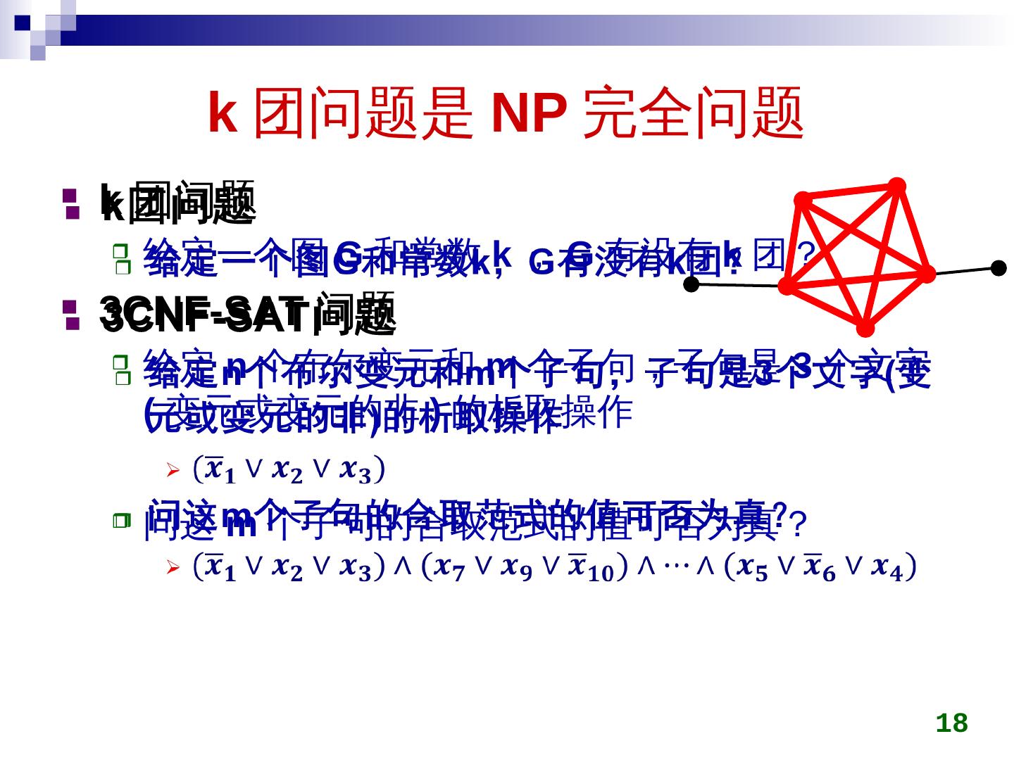 18 .k 团问题是 NP 完全问题 k 团问题 给定一个图 G 和常数 k , G 有没有 k 团? 3CNF-SAT 问题 给定 n 个布尔变元和 m 个子句,子句是 3 个文字 ( 变元或变元的非 ) 的析取操作 问这 m 个子句的合取范式 的值可否为真 ? 18