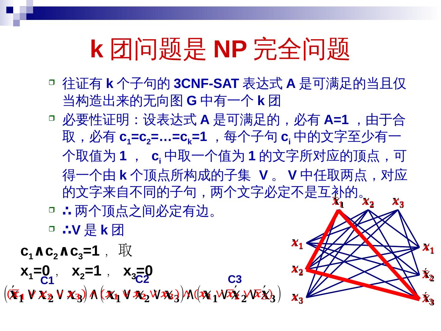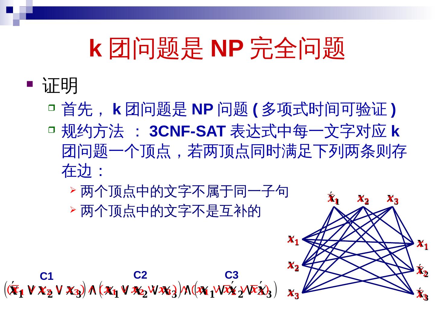 19 .k 团问题是 NP 完全问题 证明 首先, k 团问题是 NP 问题 ( 多项式时间可验证 ) 规约方法 : 3CNF-SAT 表达式中每一文字对应 k 团问题一个顶点, 若两顶点 同时满足下列两 条 则存在 边 : 两个顶点中的文字不属于同一 子句 两 个顶点 中的文字不是互补的 C1 C2 C3