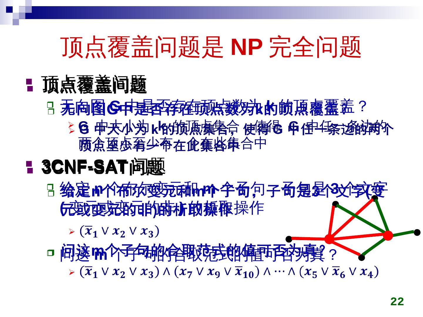 22 .顶点覆盖 问题是 NP 完全问题 顶点覆盖问题 无向图 G 中是否存在顶点数为 k 的顶点覆盖? G 中大小为 k 的顶点集合,使得 G 中 任一条边的两个顶点至少有一个在此集合中 3CNF-SAT 问题 给定 n 个布尔变元和 m 个子句,子句是 3 个文字 ( 变元或变元的非 ) 的析取操作 问这 m 个子句的合取范式的值可否为真? 22