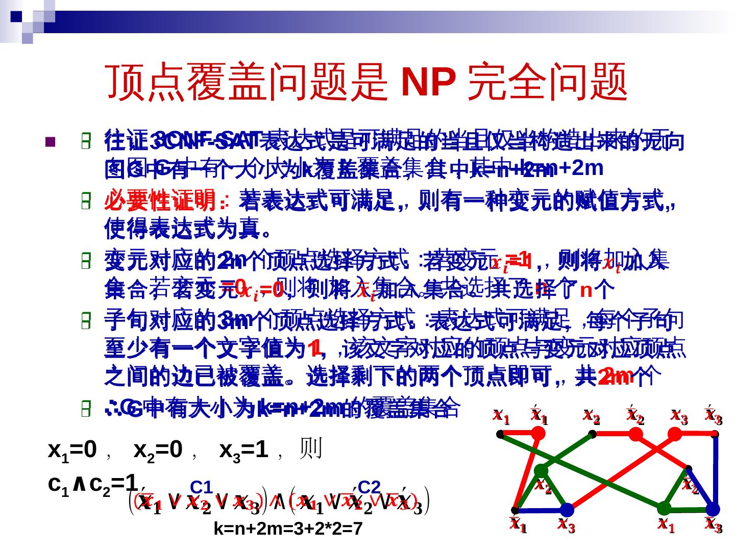 23 .顶点覆盖 问题是 NP 完全问题 证明 首先 , 顶点覆盖问题是 NP 问题 ( 多项式时间可验证 ) 规约方法 : n 个变元对应 2n 个顶点 ( 和 , 共 2n 个 ) , 和 间有边 m 个子句对应 3m 个顶点 (3m 文字 ), 子句内文字两两有边 子句内的文字与变元对应的顶点间有边 令 k=n+2m C1 C2 k=n+2m=3+2 * 2=7
