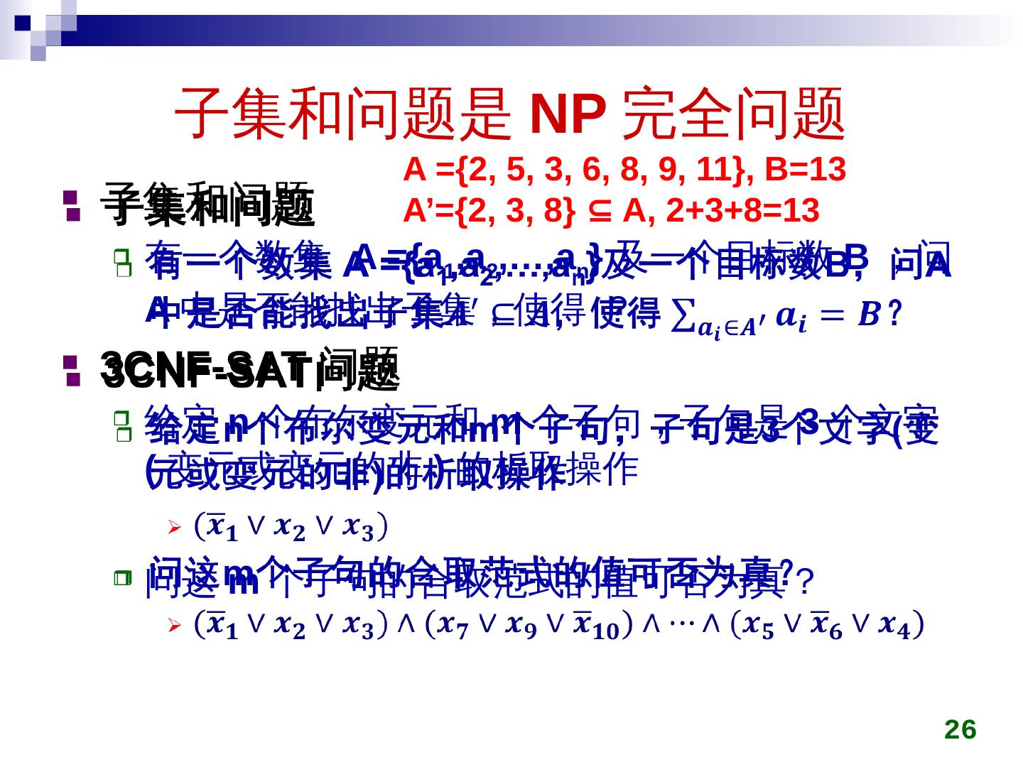 26 .子集和问题是 NP 完全问题 子集和问题 有一个数 集 A ={ a 1 ,a 2 , … ,a n } 及一 个目标数 B , 问 A 中是否能 找出子集 , 使得 ? 3CNF-SAT 问题 给定 n 个布尔变元和 m 个子句,子句是 3 个文字 ( 变元或变元的非 ) 的析取操作 问这 m 个子句的合取范式的值可否为真? 26 A ={2, 5, 3, 6, 8, 9, 11}, B=13 A’={2, 3, 8} ⊆ A , 2+3+8=13