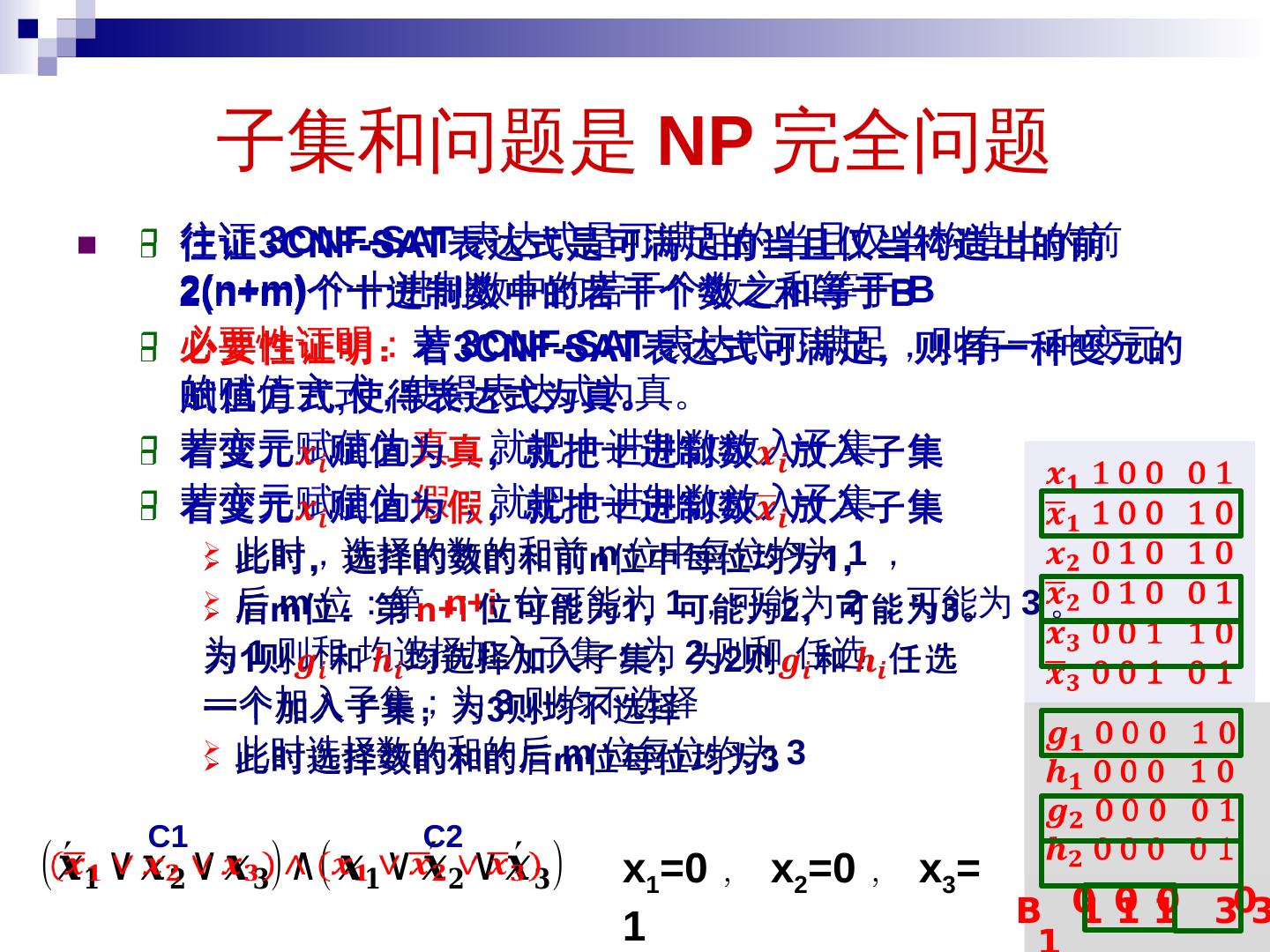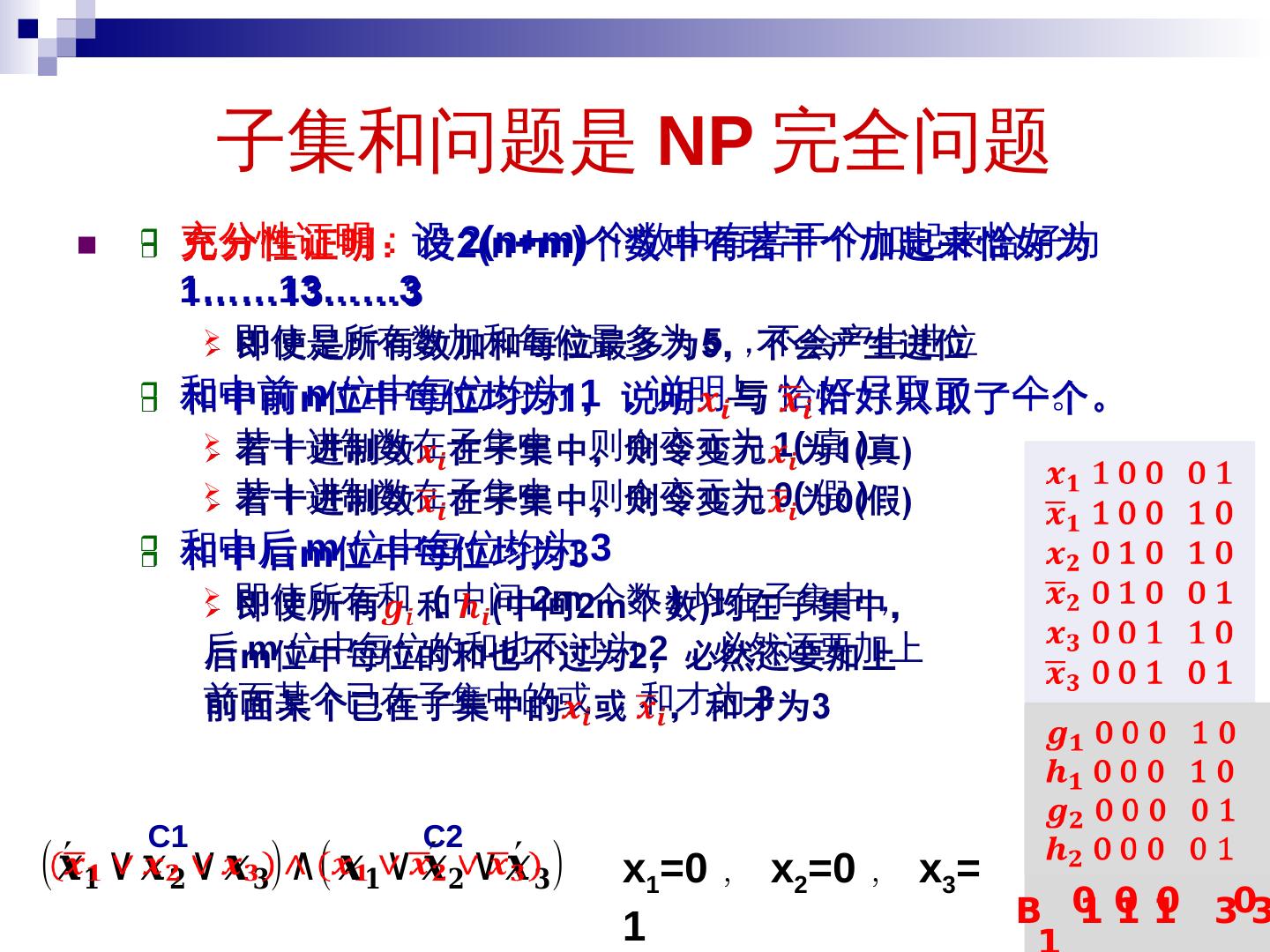 29 . 1 0 0 0 1 1 0 0 1 0 0 1 0 1 0 0 1 0 0 1 0 0 1 1 0 0 0 1 0 1 0 0 0 1 0 0 0 0 1 0 0 0 0 0 1 0 0 0 0 1 B 1 1 1 3 3 子集和问题是 NP 完全问题 充分性证明: 设 2( n+m ) 个数中有若干个加起来恰好为 1 …… 13 …… 3 即使是所有数加和每位最多为 5 ,不会产生进位 和中 前 n 位 中 每位均为 1 ,说明 与 恰好 只 取 了一个。 若 十进制 数 在 子集中,则令 变 元 为 1( 真 ) 若 十进制数 在 子集中,则 令 变元 为 0( 假 ) 和中后 m 位中每位均为 3 即使所有 和 ( 中间 2m 个数 ) 均在子集中, 后 m 位中每位 的 和也不过为 2 ,必然还要加上 前面某个已在子集中的 或 ,和才为 3 C1 C2 x 1 =0 , x 2 =0 , x 3 =1