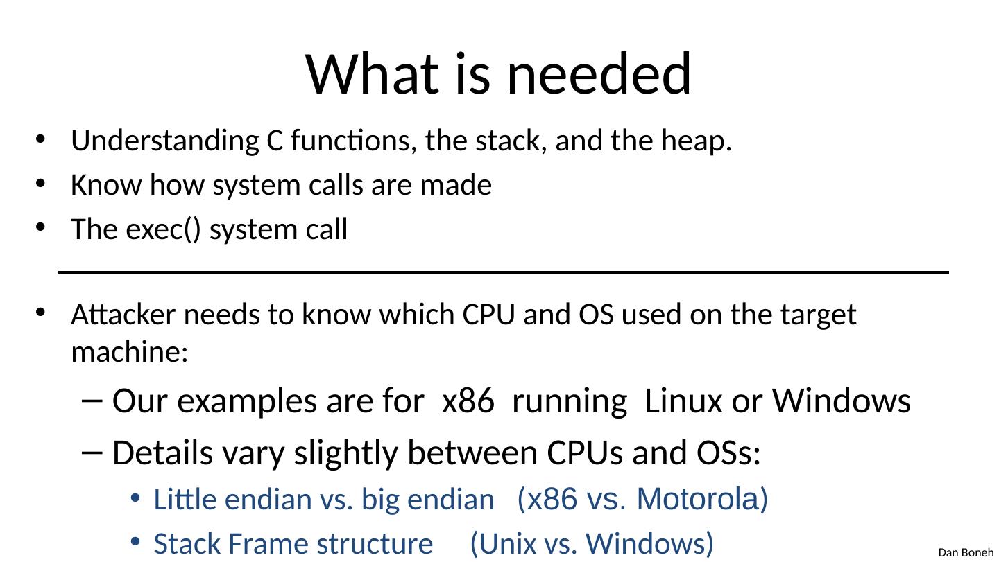 4 .What is needed Understanding C functions, the stack, and the heap. Know how system calls are made The exec() system call Attacker needs to know which CPU and OS used on the target machine: Our examples are for x86 running Linux or Windows Details vary slightly between CPUs and OSs: Little endian vs. big endian ( x86 vs. Motorola ) Stack Frame structure (Unix vs. Windows)