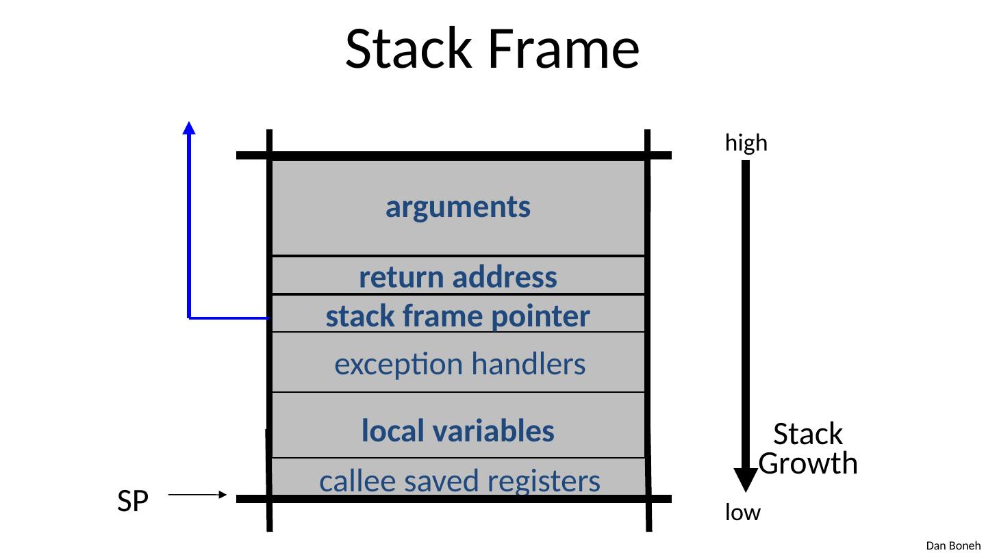 6 .exception handlers Stack Frame arguments return address stack frame pointer local variables SP Stack Growth high low callee saved registers