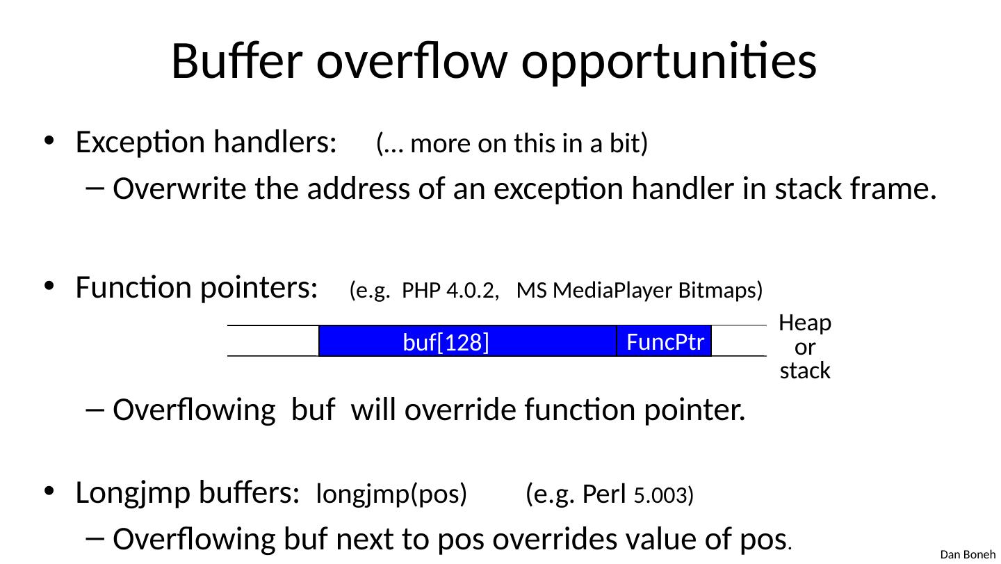 13 .Buffer overflow opportunities Exception handlers: ( … more on this in a bit) Overwrite the address of an exception handler in stack frame. Function pointers: (e.g. PHP 4.0.2, MS MediaPlayer Bitmaps) Overflowing buf will override function pointer. Longjmp buffers: longjmp (pos) (e.g. Perl 5.003) Overflowing buf next to pos overrides value of pos . Heap or stack buf [128] FuncPtr