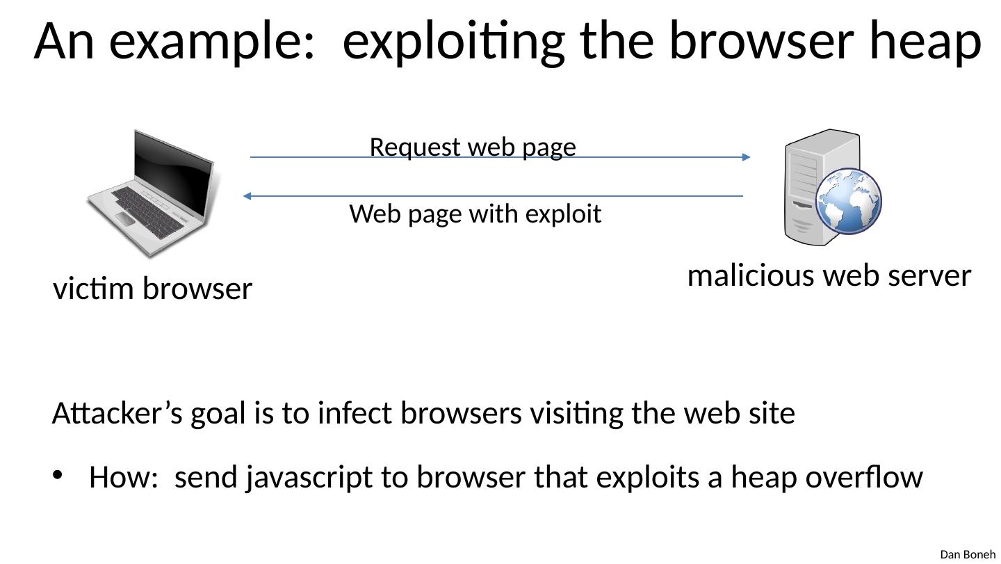 15 .An example: exploiting the browser heap Attacker’s goal is to infect browsers visiting the web site How: send javascript to browser that exploits a heap overflow malicious web server victim browser Request web page Web page with exploit