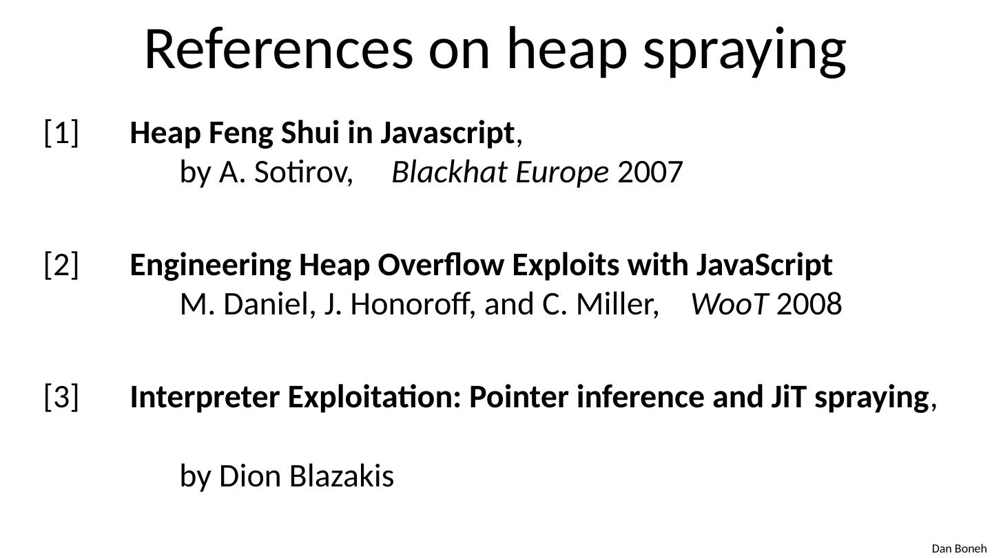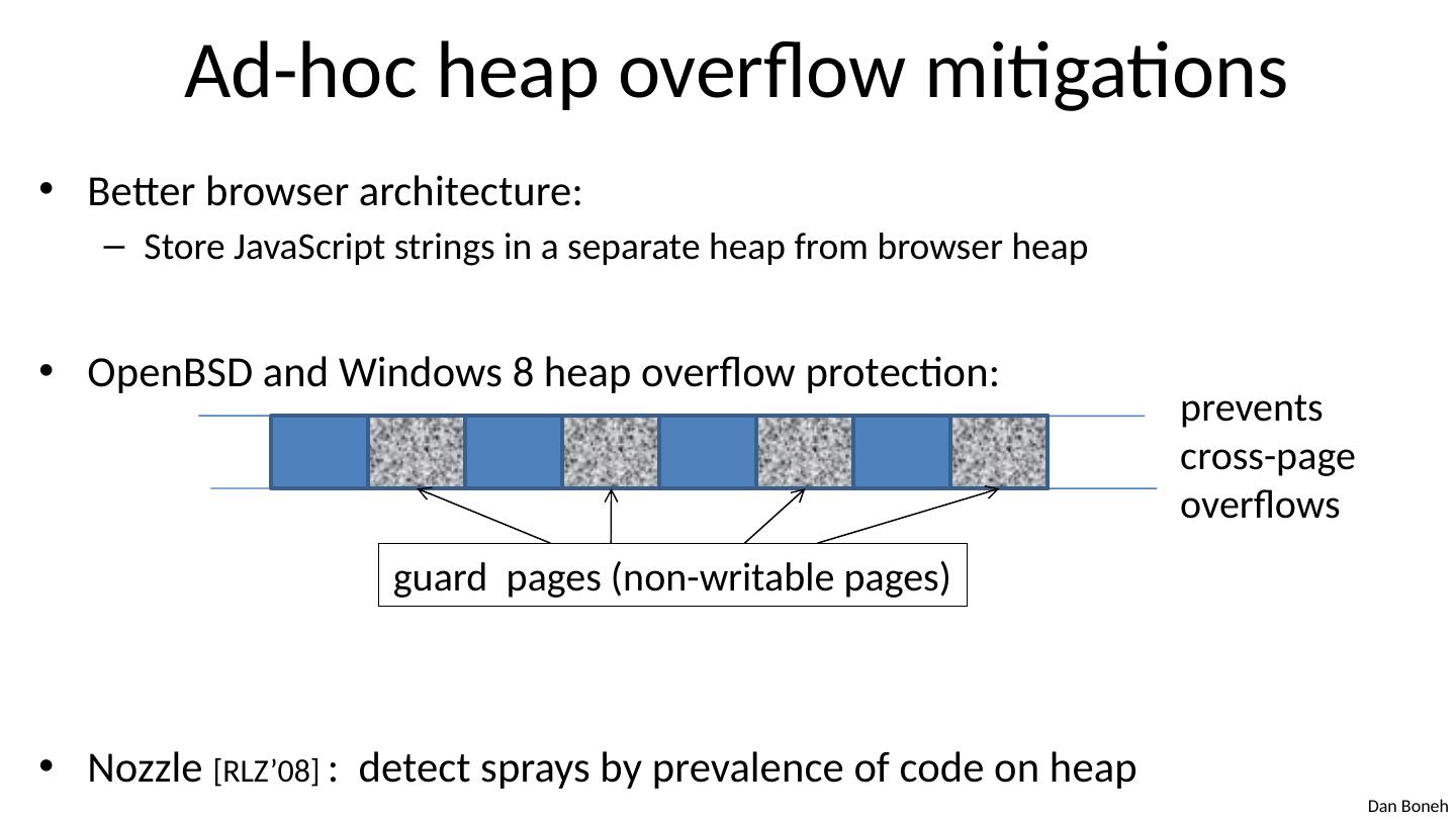 19 . Ad-hoc heap overflow mitigations Better browser architecture: Store JavaScript strings in a separate heap from browser heap OpenBSD and Windows 8 heap overflow protection: Nozzle [RLZ’08] : detect sprays by prevalence of code on heap guard pages (non-writable pages) prevents cross-page overflows