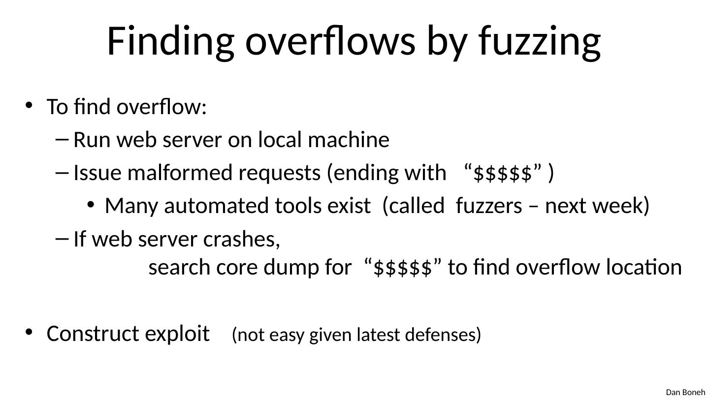 20 .Finding overflows by fuzzing To find overflow: Run web server on local machine Issue malformed requests (ending with “$$$$$” ) Many automated tools exist (called fuzzers – next week) If web server crashes, search core dump for “$$$$$” to find overflow location Construct exploit (not easy given latest defenses)