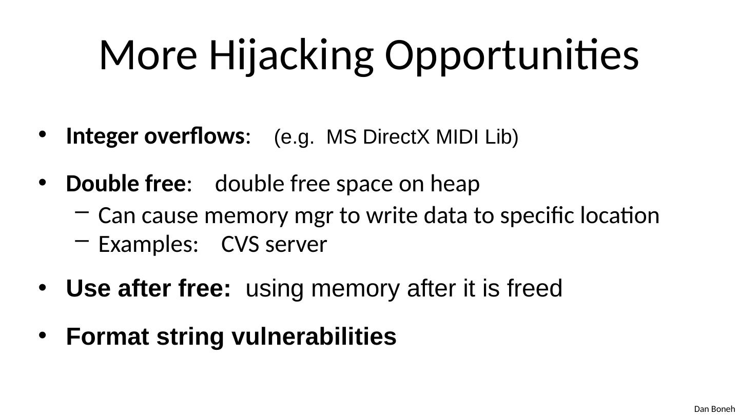 22 .More Hijacking Opportunities Integer overflows : (e.g. MS DirectX MIDI Lib) Double free : double free space on heap Can cause memory mgr to write data to specific location Examples: CVS server Use after free: using memory after it is freed Format string vulnerabilities