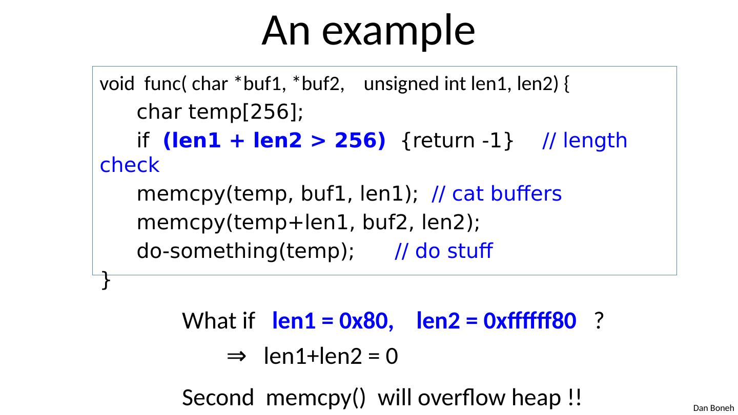 24 .An example void func ( char *buf1, *buf2, unsigned int len1, len2) { char temp[256]; if (len1 + len2 > 256) {return -1} // length check memcpy (temp, buf1, len1); // cat buffers memcpy (temp+len1, buf2, len2); do-something(temp); // do stuff } What if len1 = 0x80, len2 = 0xffffff80 ? ⇒ len1+len2 = 0 Second memcpy () will overflow heap !!