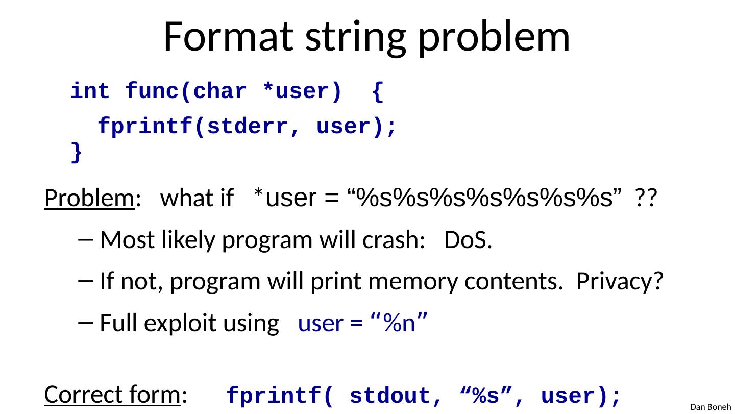 27 .Format string problem int func (char *user) { fprintf ( stderr , user); } Problem : what if * user = “% s%s%s%s%s%s%s ” ?? Most likely program will crash: DoS . If not, program will print memory contents. Privacy? Full exploit using user = “ %n ” Correct form : fprintf ( stdout , “%s”, user);