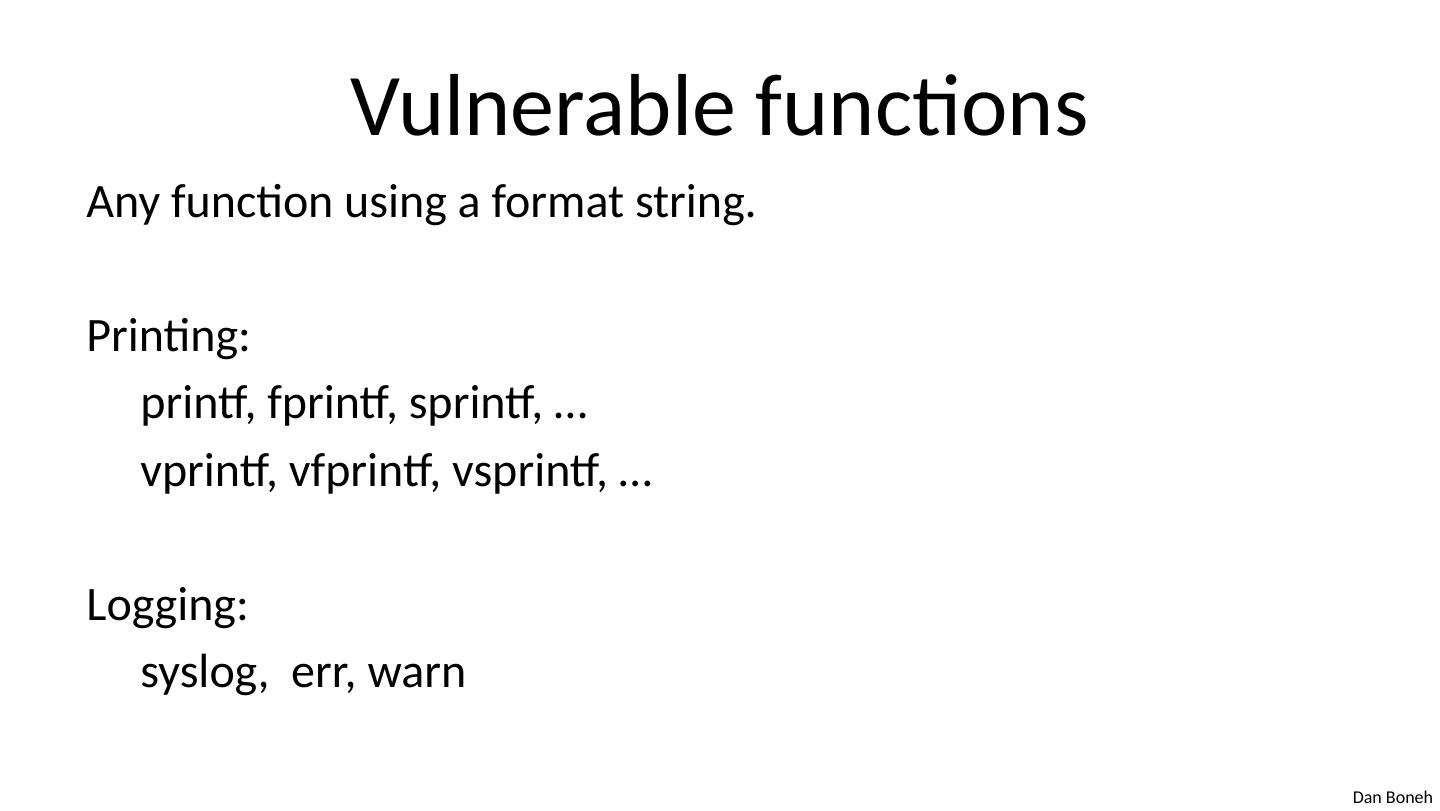 28 .Vulnerable functions Any function using a format string. Printing: printf, fprintf, sprintf, … vprintf, vfprintf, vsprintf, … Logging: syslog, err, warn