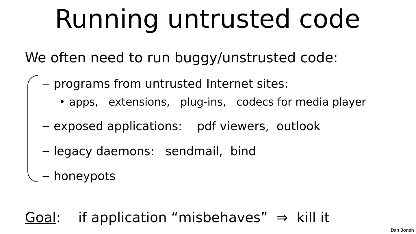2 .Running untrusted code We often need to run buggy/ unstrusted code: programs from untrusted Internet sites: apps, extensions, plug-ins, codecs for media player e xposed applications: pdf viewers, outlook legacy daemons: sendmail , bind honeypots Goal : if application “ misbehaves ” ⇒ kill it