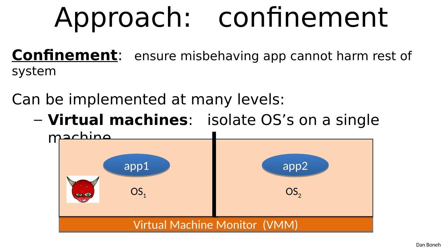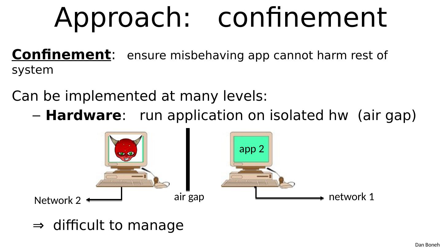 3 .Approach: confinement Confinement : ensure misbehaving app cannot harm rest of system Can be implemented at many levels : Hardware : run application on isolated hw (air gap) ⇒ difficult to manage a ir gap n etwork 1 Network 2 a pp 1 a pp 2