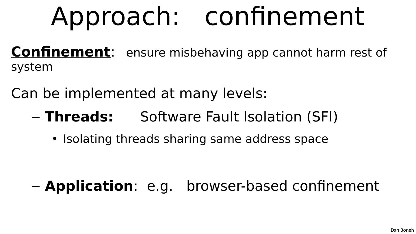 6 .Approach: confinement Confinement : ensure misbehaving app cannot harm rest of system Can be implemented at many levels : Threads: Software Fault Isolation (SFI ) Isolating threads sharing same address space Application : e.g. browser-based confinement