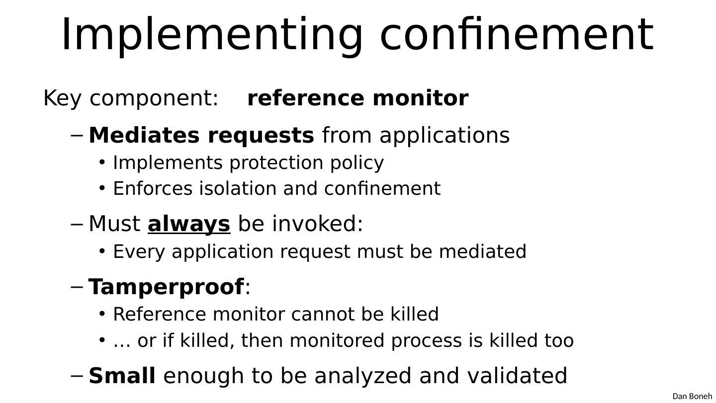 7 .Implementing confinement Key component: reference monitor Mediates requests from applications Implements protection policy Enforces isolation and confinement Must always be invoked: Every application request must be mediated Tamperproof : Reference monitor cannot be killed … or if killed, then monitored process is killed too Small enough to be analyzed and validated