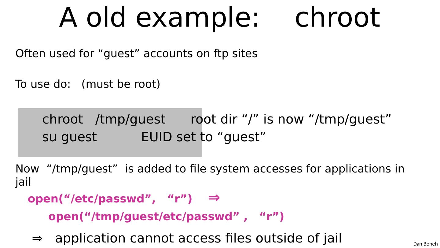 8 .A old example : chroot Often used for “ guest ” accounts on ftp sites To use do: (must be root) chroot / tmp /guest root dir “ / ” is now “ / tmp /guest ” su guest EUID set to “ guest ” Now “ / tmp /guest ” is added to file system accesses for applications in jail open( “ / etc / passwd ” , “ r ” ) ⇒ open( “ / tmp /guest/etc/ passwd ” , “ r ” ) ⇒ application cannot access files outside of jail