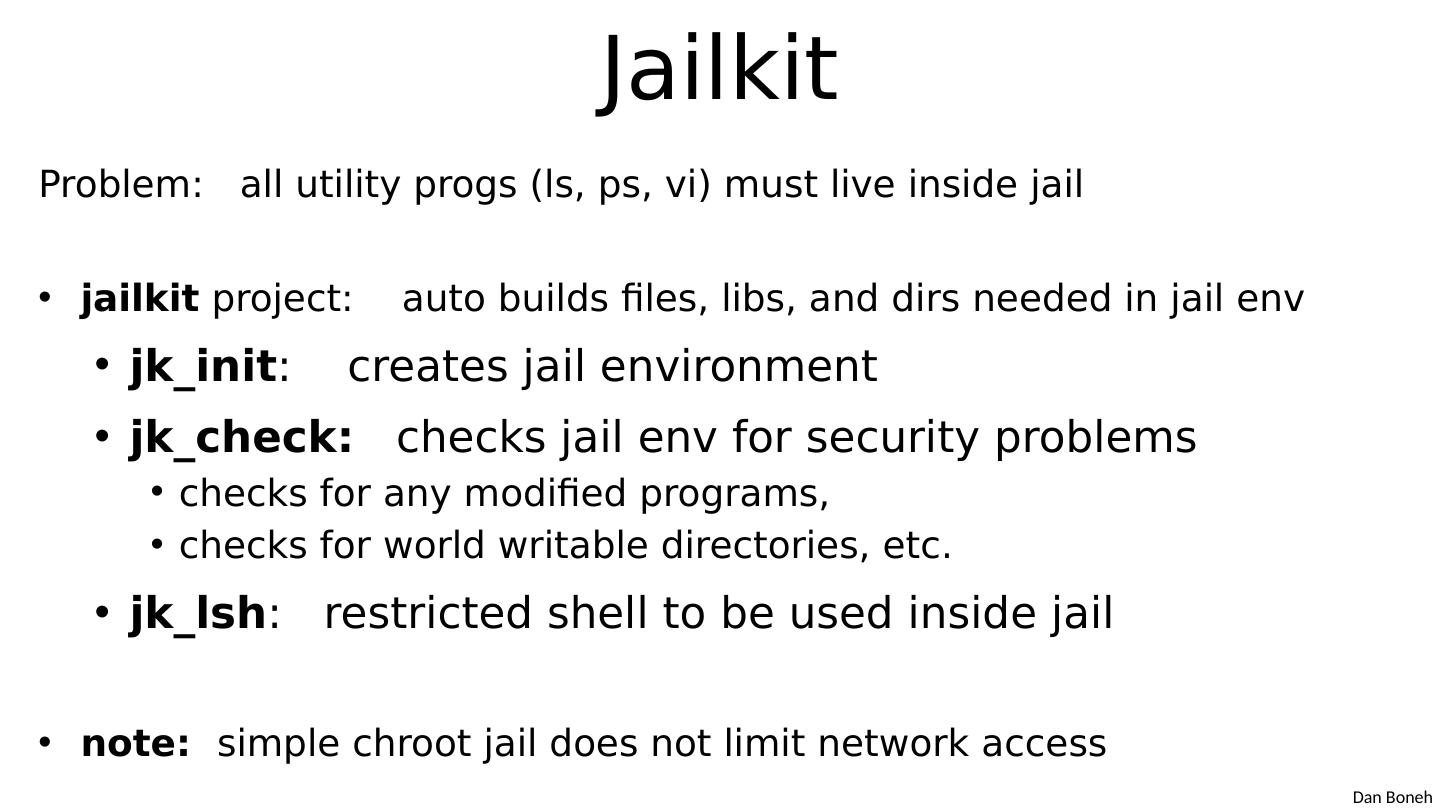9 .Jailkit Problem: all utility progs ( ls , ps , vi) must live inside jail jailkit project: auto builds files, libs, and dirs needed in jail env jk_init : creates jail environment jk_check : checks jail env for security problems checks for any modified programs, checks for world writable directories, etc. jk_lsh : restricted shell to be used inside jail note: simple chroot jail does not limit network access
