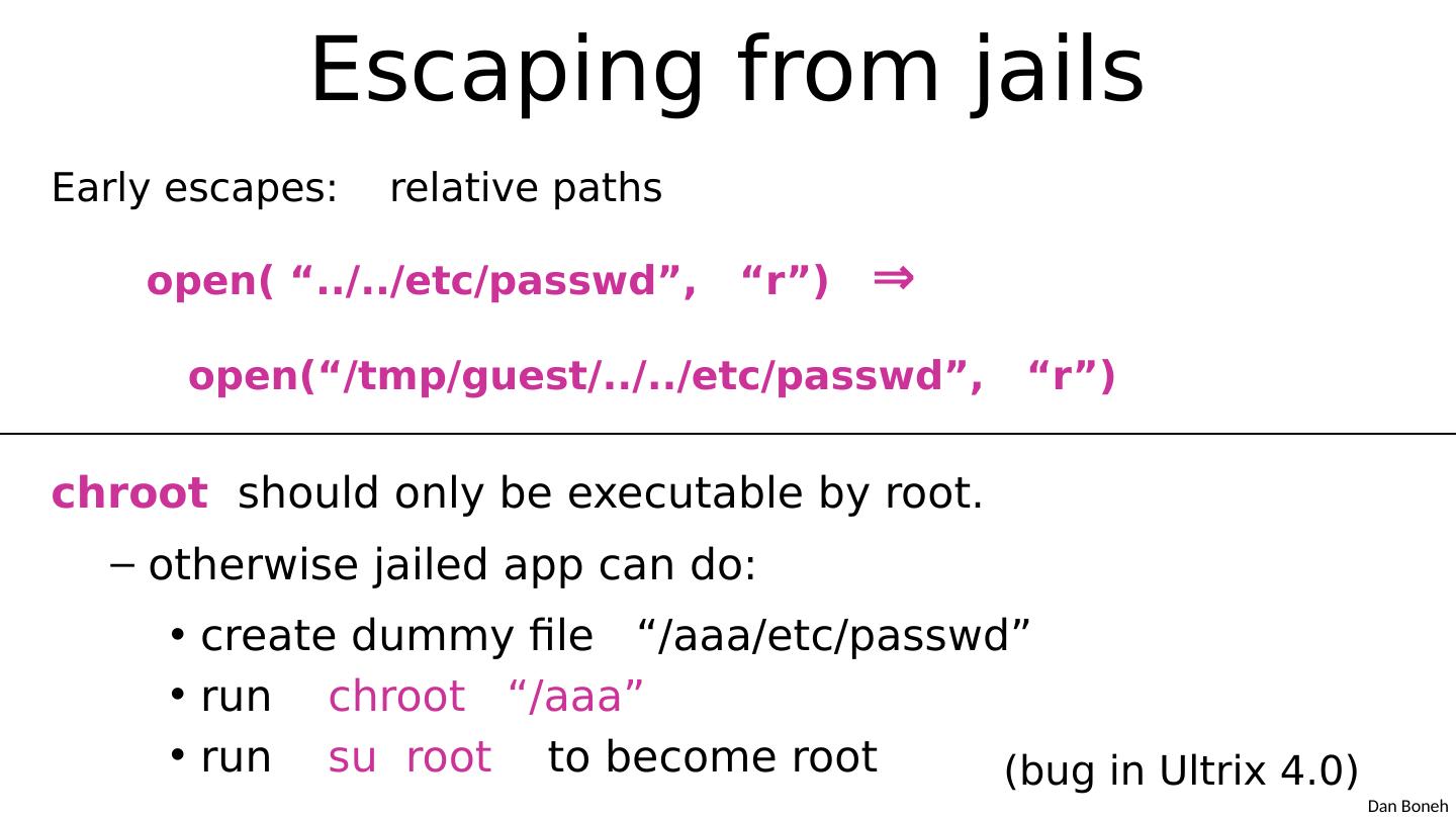 10 .Escaping from jails Early escapes: relative paths open( “ ../../ etc / passwd ” , “ r ” ) ⇒ open( “ / tmp /guest/../../ etc / passwd ” , “ r ” ) chroot should only be executable by root. otherwise jailed app can do: create dummy file “ / aaa / etc / passwd ” run chroot “ / aaa ” run su root to become root (bug in Ultrix 4.0 )