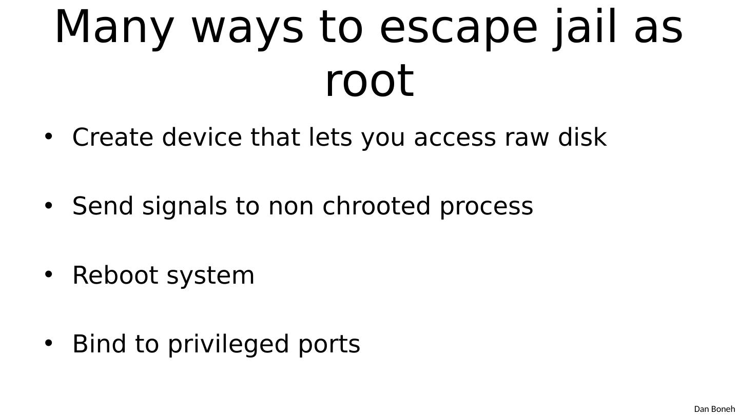 11 .Many ways to escape jail as root Create device that lets you access raw disk Send signals to non chrooted process Reboot system Bind to privileged ports