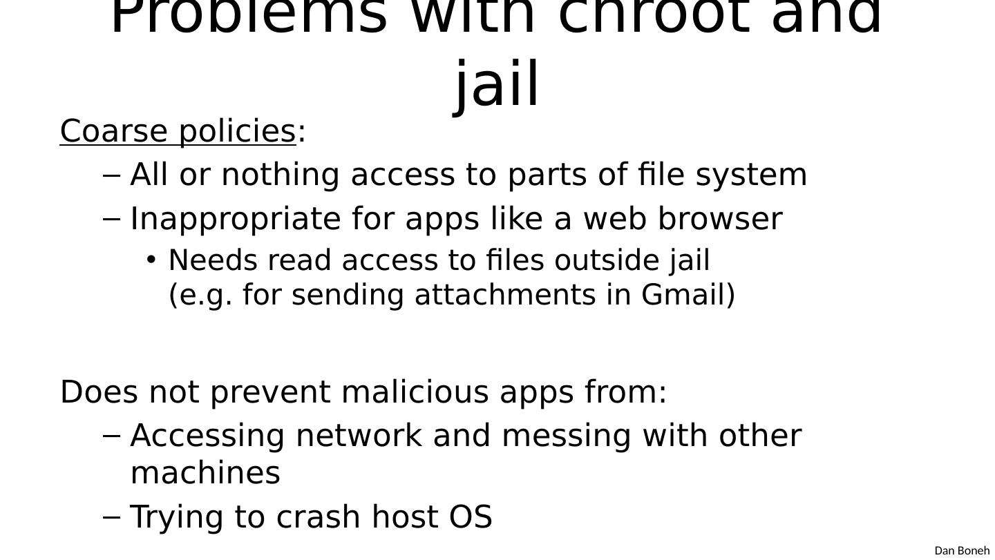 14 .Problems with chroot and jail Coarse policies : All or nothing access to parts of file system Inappropriate for apps like a web browser Needs read access to files outside jail (e.g. for sending attachments in G mail ) Does not prevent malicious apps from: Accessing network and messing with other machines Trying to crash host OS