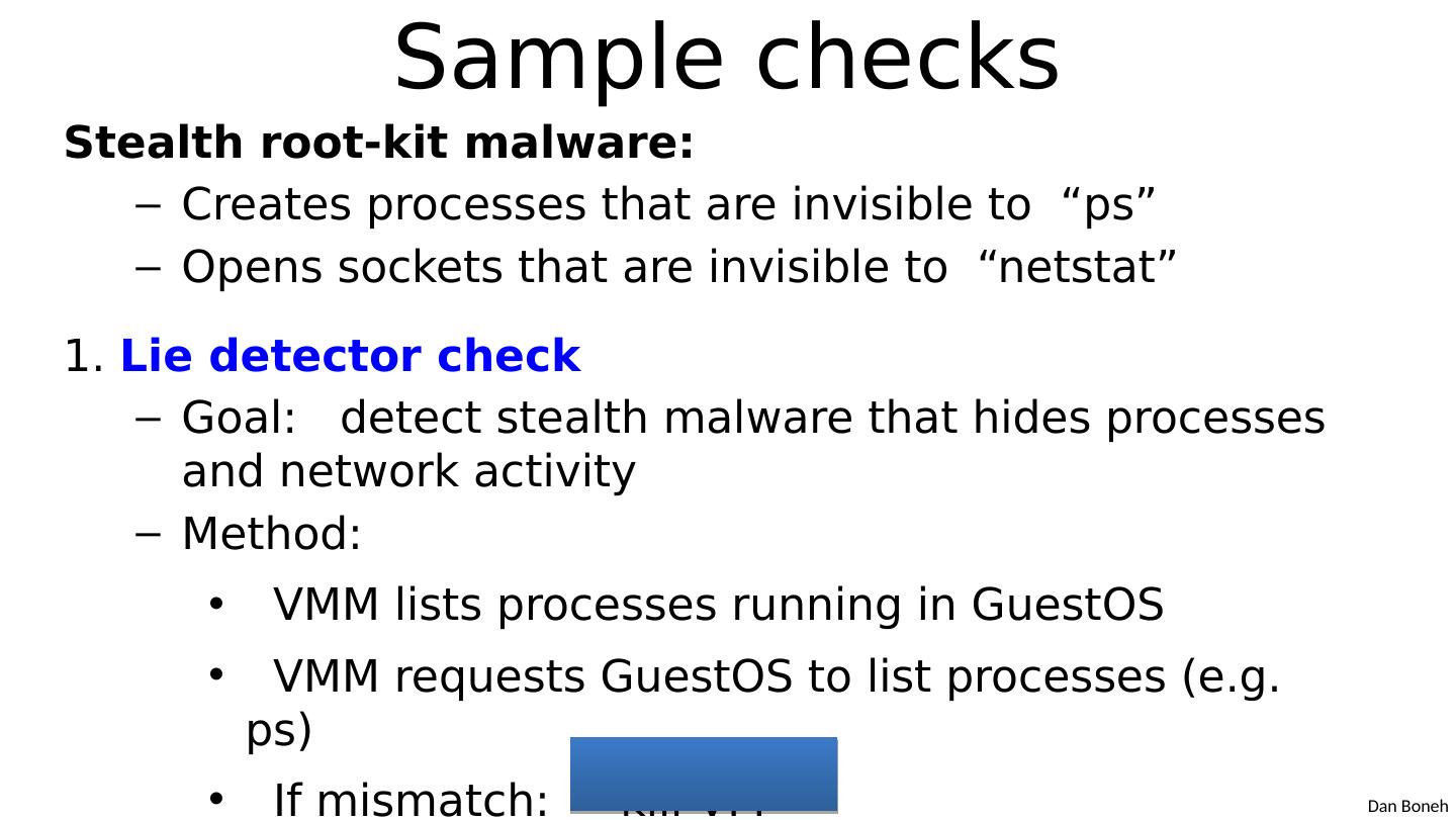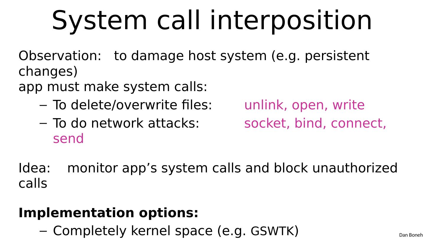16 .System call interposition Observation: to damage host system (e.g. persistent changes) app must make system calls: To delete/overwrite files: unlink , open, write To do network attacks: socket , bind, connect, send Idea: monitor app’s system calls and block unauthorized calls I mplementation options: Completely kernel space (e.g. GSWTK ) Completely user space (e.g. program shepherding) Hybrid (e.g. Systrace )