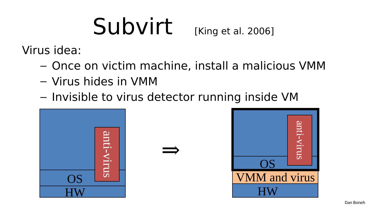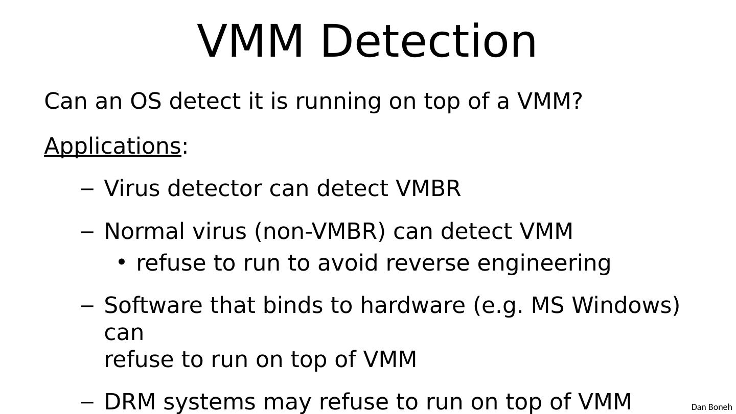 28 .VMM security assumption VMM Security assumption : Malware can infect guest OS and guest apps But malware cannot escape from the infected V M Cannot infect host OS Cannot infect other VMs on the same hardware Requires that VMM protect itself and is not buggy VMM is much simpler than full OS … but device drivers run in Host OS