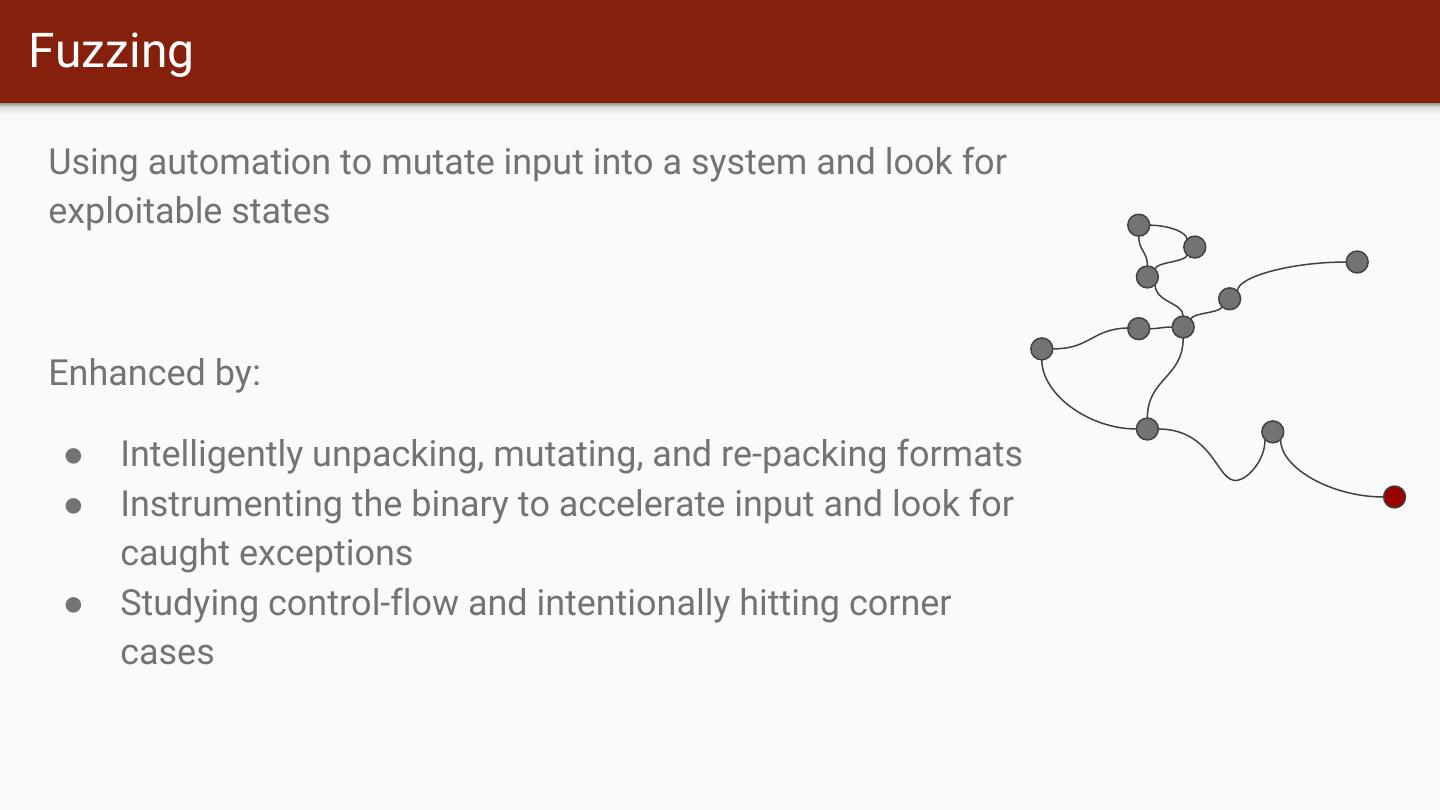 6 .Fuzzing Using automation to mutate input into a system and look for exploitable states Enhanced by: ● Intelligently unpacking, mutating, and re-packing formats ● Instrumenting the binary to accelerate input and look for caught exceptions ● Studying control-flow and intentionally hitting corner cases