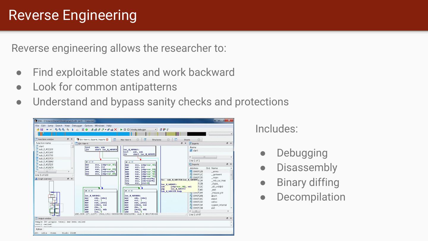 8 .Reverse Engineering Reverse engineering allows the researcher to: ● Find exploitable states and work backward ● Look for common antipatterns ● Understand and bypass sanity checks and protections Includes: ● Debugging ● Disassembly ● Binary diffing ● Decompilation