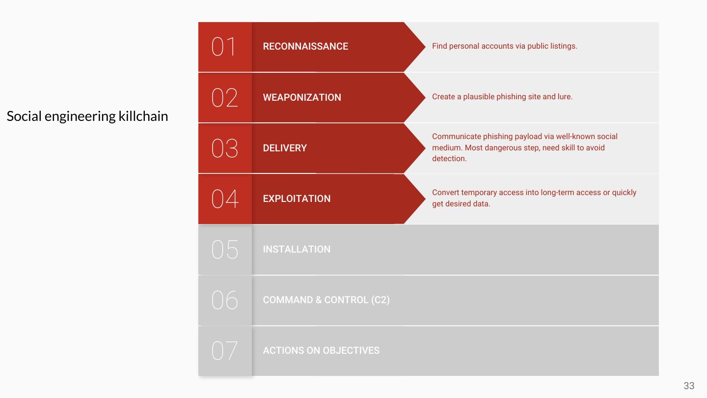 28 .Leadership Model of high-end operations Tasking Strategy Target Selection Operational Teams East-West Exploit Passive Recon Grooming Movement Exfiltration Deployment / Escalation East-West Exploit Passive Recon Grooming Movement Exfiltration Deployment / Escalation Central R&D team Vulnerability Research Weaponization Infrastructure Creation 28