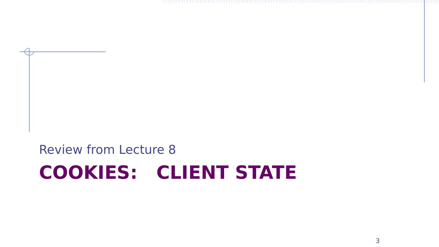 2 .Outline Cookie fundamentals Cookie policy: setting and retrieving cookies Cookie protocol problems Web session management Session state and authentication Session hijacking Token stealing Session fixation
