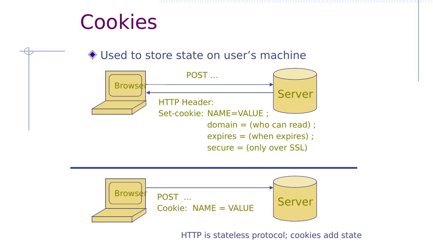 21 .Cookies have no integrity User can change and delete cookie values Edit cookie database (FF: cookies.sqlite ) Modify Cookie header (FF: TamperData extension) Silly example: shopping cart software Set-cookie: shopping-cart-total = 150 ($) User edits cookie file (cookie poisoning): Cookie: shopping-cart-total = 15 ($) Similar problem with hidden fields <INPUT TYPE= “ hidden ” NAME=price VALUE= “ 150 ” > 21