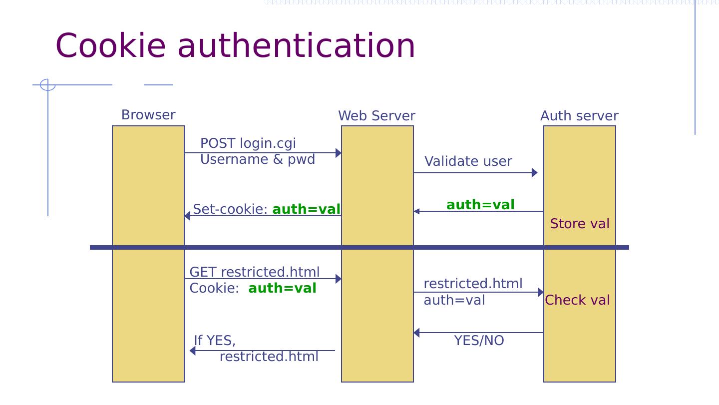 5 .Cookie authentication Browser Web Server Auth server POST login.cgi Username & pwd Validate user auth=val Store val Set-cookie: auth=val GET restricted.html Cookie: auth=val restricted.html auth=val YES/NO If YES, restricted.html Check val