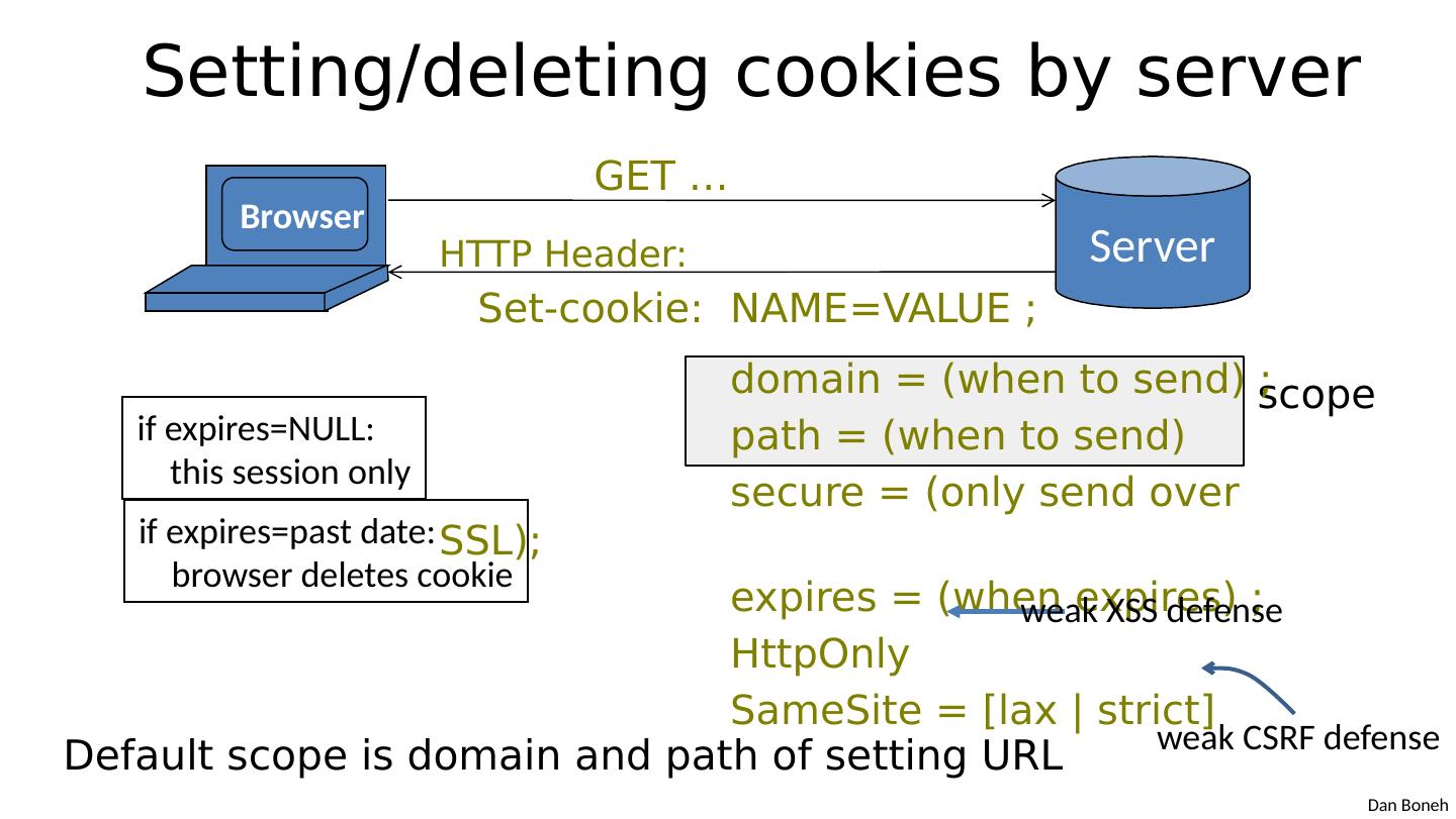 8 .scope Setting/deleting cookies by server Default scope is domain and path of setting URL Browser Server GET … HTTP Header: Set-cookie: NAME=VALUE ; domain = (when to send) ; path = (when to send) secure = (only send over SSL); expires = (when expires) ; HttpOnly SameSite = [lax | strict] if expires=NULL: this session only if expires= past date : browser deletes cookie weak XSS defense weak CSRF defense