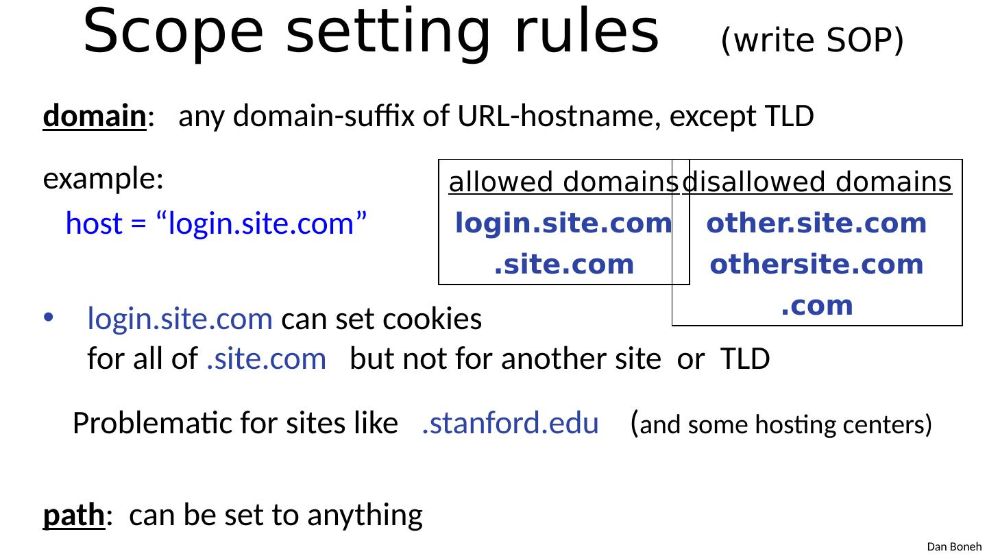 9 .Scope setting rules (write SOP) domain : any domain-suffix of URL-hostname, except TLD example: host = “ login.site.com ” login.site.com can set cookies for all of . site.com but not for another site or TLD Problematic for sites like .stanford.edu ( and some hosting centers) path : can be set to anything allowed domains login.site.com . site.com disallowed domains other.site.com othersite.com .com