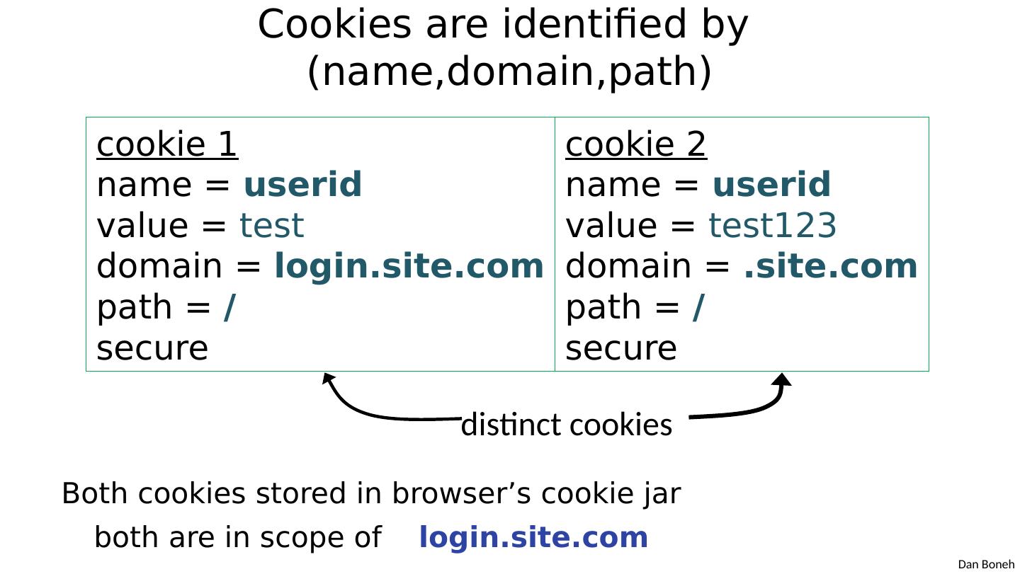 10 .Cookies are identified by (name,domain,path) Both cookies stored in browser’ s cookie jar both are in scope of login.site.com cookie 1 name = userid value = test domain = login.site.com path = / secure cookie 2 name = userid value = test123 domain = . site.com path = / secure distinct cookies