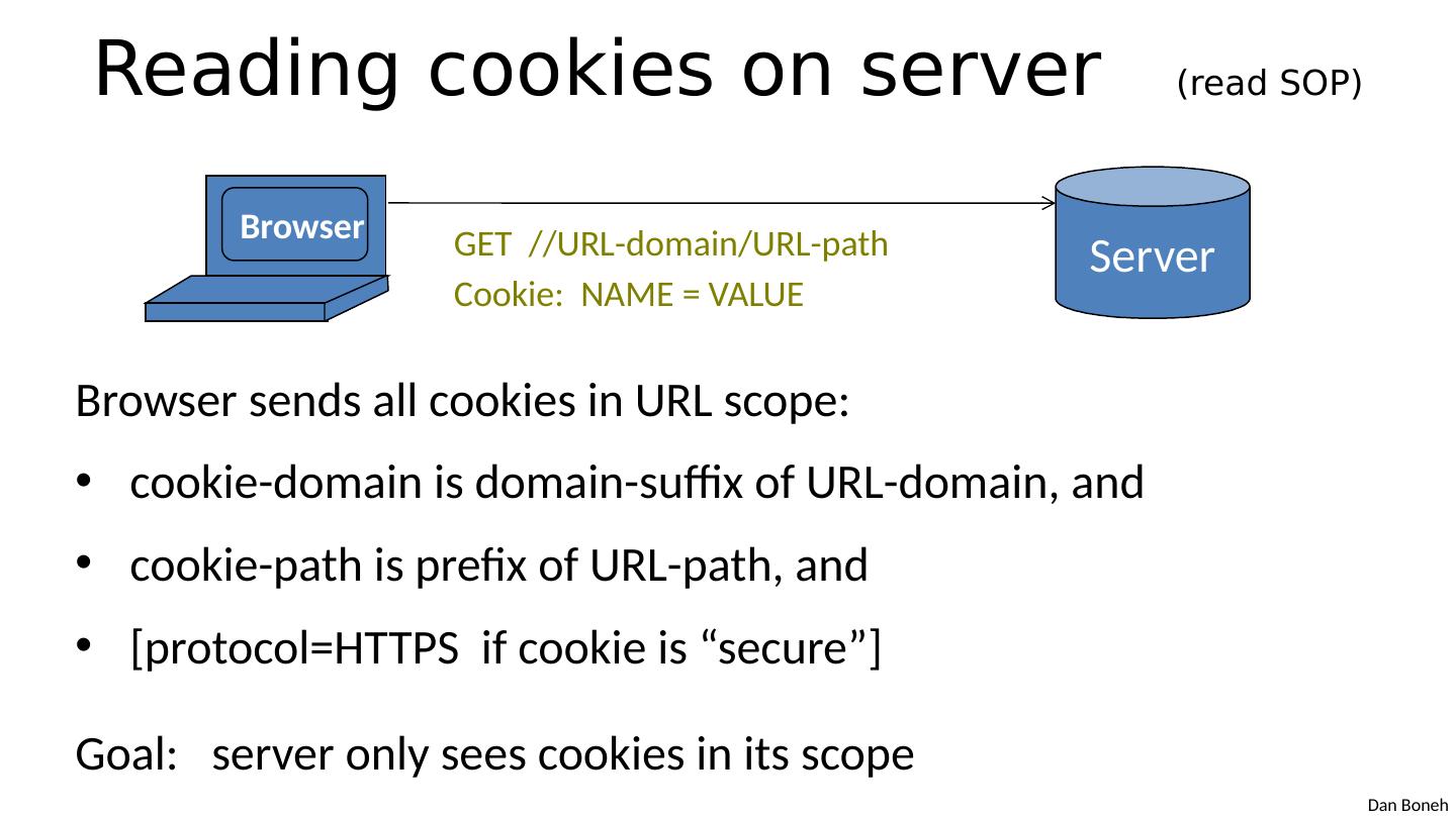 11 .Reading cookies on server (read SOP) Browser sends all cookies in URL scope: cookie-domain is domain-suffix of URL-domain, and cookie-path is prefix of URL-path, and [protocol=HTTPS if cookie is “ secure ” ] Goal: server only sees cookies in its scope Browser Server GET //URL-domain/URL-path Cookie: NAME = VALUE