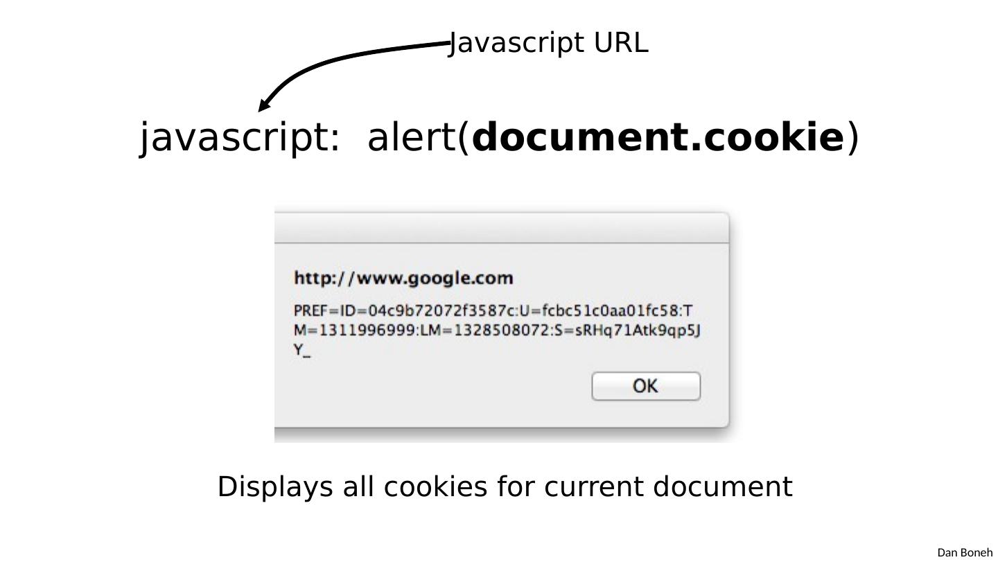 14 .javascript: alert( document.cookie ) Javascript URL Displays all cookies for current document