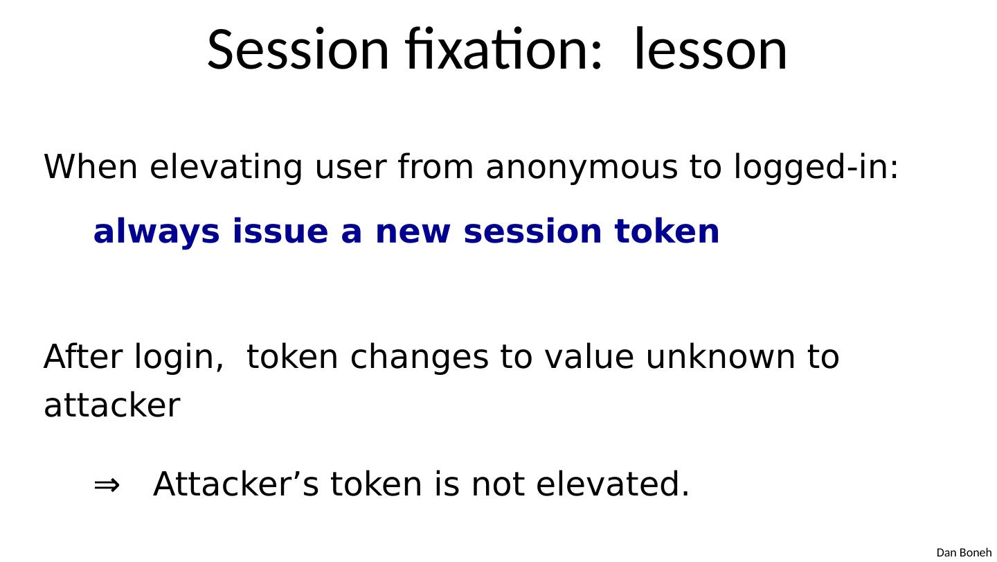 19 .Example 2: “ secure ” cookies are not secure Alice logs in at https :// accounts.google.com Alice visits http :// www.google.com (cleartext) Network attacker can inject into response Set-Cookie: SSID= badguy ; secure and overwrite secure cookie Problem: network attacker can re-write HTTPS cookies ! HTTPS cookie value cannot be trusted set-cookie: SSID =A7_ESAgDpKYk5TGnf; Domain=.google.com; Path=/ ; Expires=Wed, 09-Mar-2026 18:35:11 GMT; Secure; HttpOnly set-cookie: SAPISID =wj1gYKLFy-RmWybP/ANtKMtPIHNambvdI4; Domain=. google.com;Path =/ ; Expires=Wed, 09-Mar-2026 18:35:11 GMT; Secure