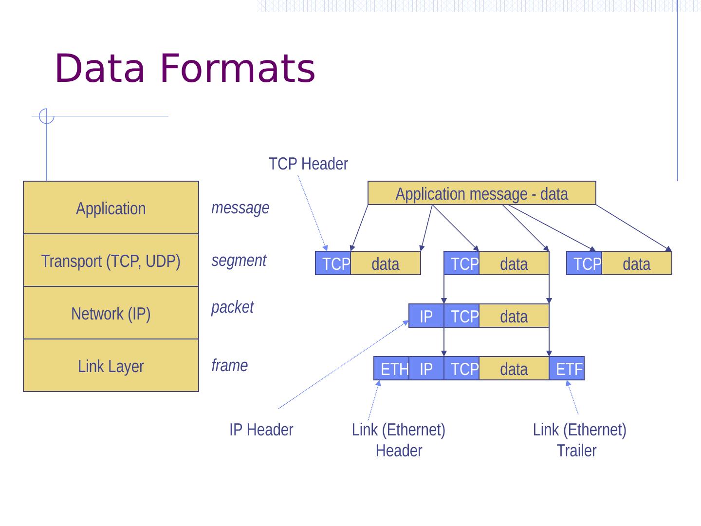 4 .Data Formats Application Transport (TCP, UDP) Network (IP) Link Layer Application message - data TCP data TCP data TCP data TCP Header data TCP IP IP Header data TCP IP ETH ETF Link (Ethernet) Header Link (Ethernet) Trailer segment packet frame message