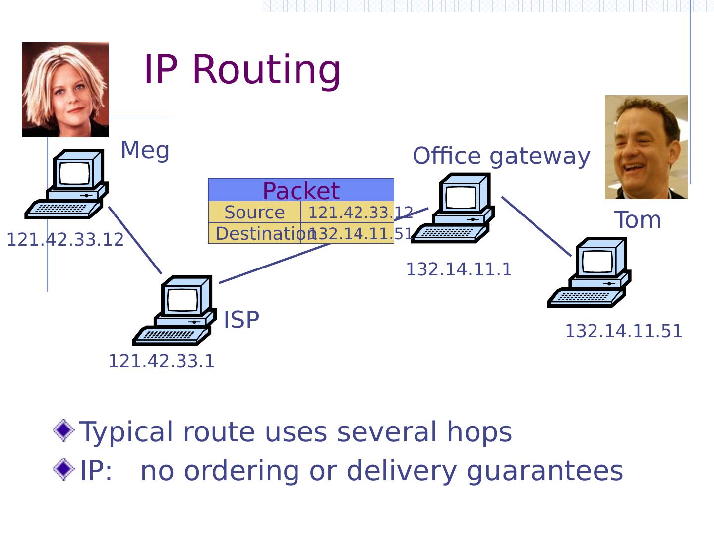 6 . IP Routing Typical route uses several hops IP: no ordering or delivery guarantees Meg Tom ISP Office gateway 121.42.33.12 132.14.11.51 Source Destination Packet 121.42.33.12 121.42.33.1 132.14.11.51 132.14.11.1