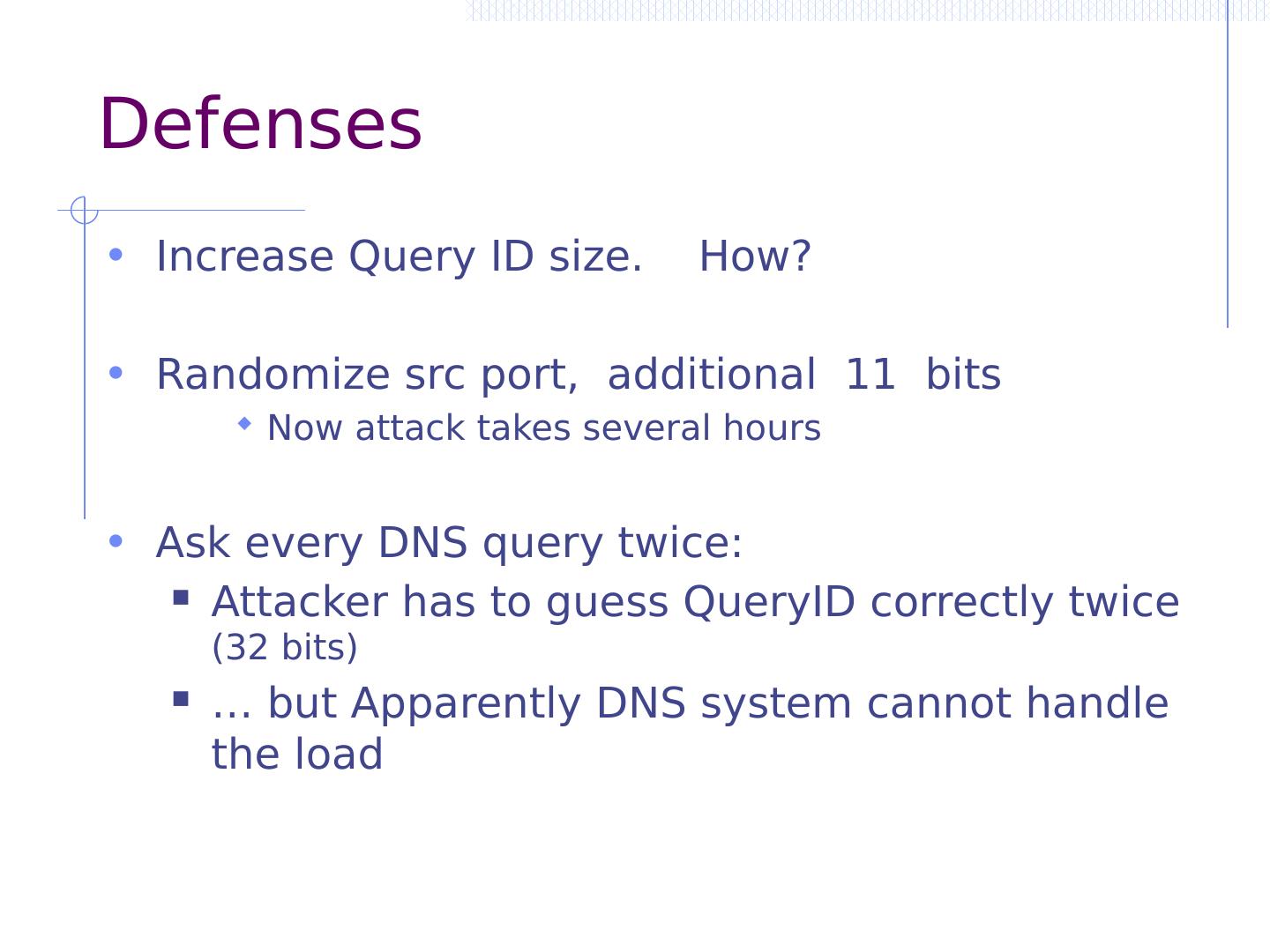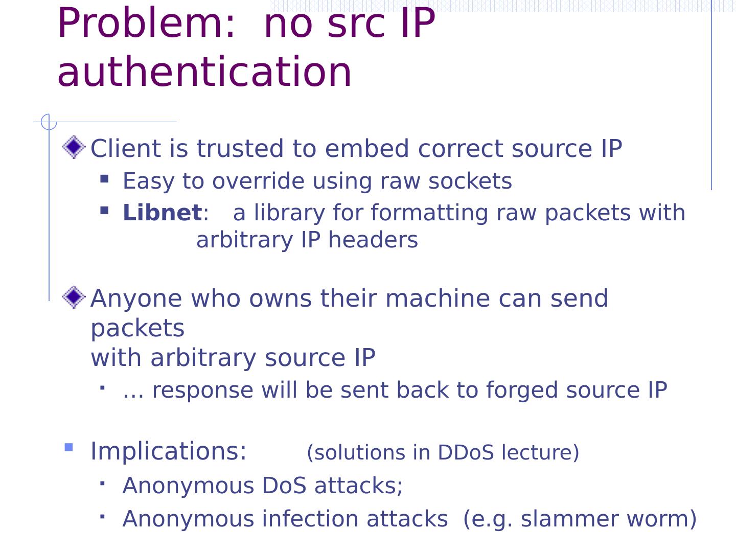 8 .Problem: no src IP authentication Client is trusted to embed correct source IP Easy to override using raw sockets Libnet : a library for formatting raw packets with arbitrary IP headers Anyone who owns their machine can send packets with arbitrary source IP … response will be sent back to forged source IP Implications : (solutions in DDoS lecture) Anonymous DoS attacks; Anonymous infection attacks (e.g. slammer worm)