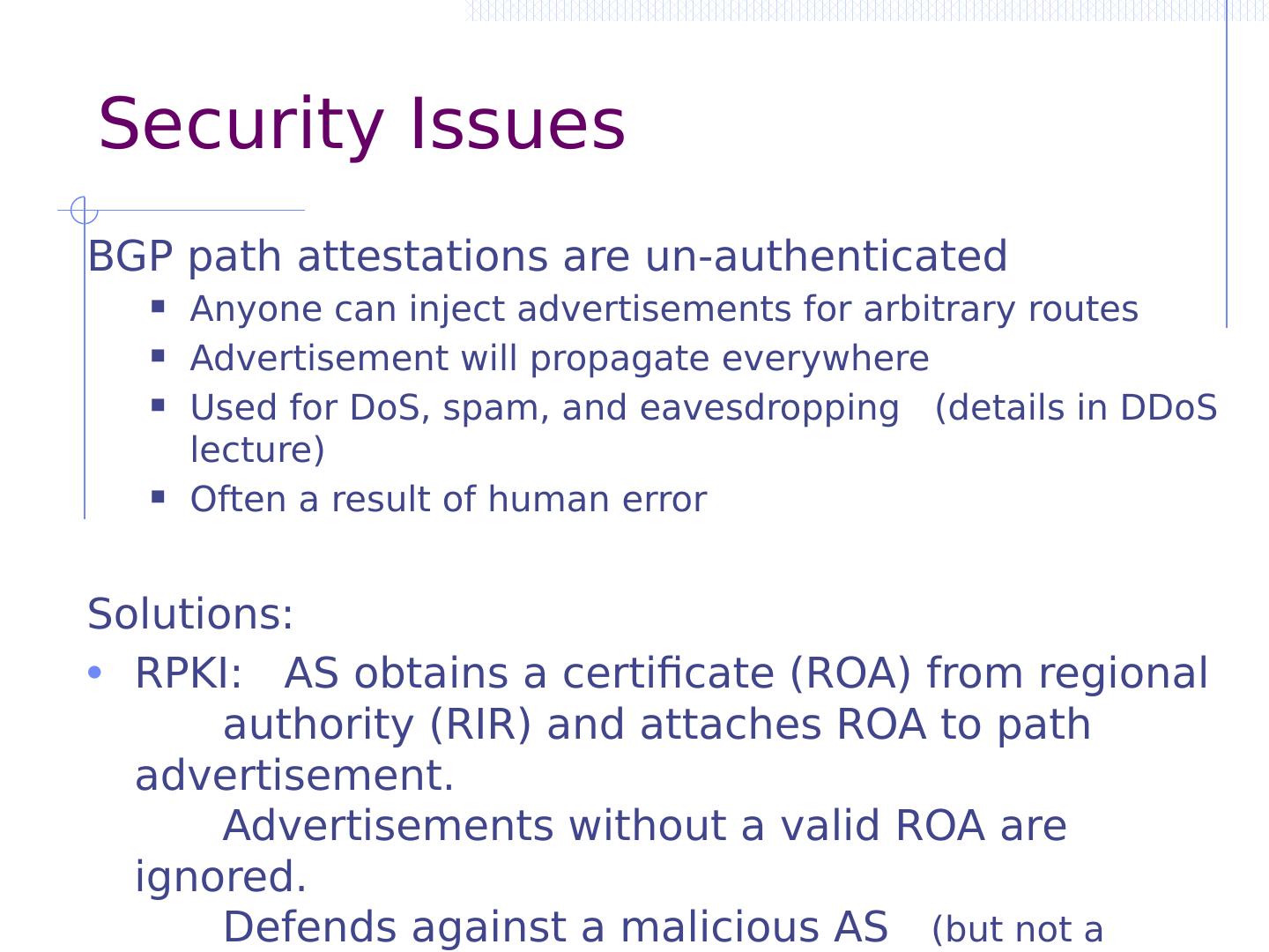 19 .Security Issues BGP path attestations are un-authenticated Anyone can inject advertisements for arbitrary routes Advertisement will propagate everywhere Used for DoS , spam, and eavesdropping (details in DDoS lecture) Often a result of human error Solutions: RPKI: AS obtains a certificate (ROA) from regional authority (RIR) and attaches ROA to path advertisement. Advertisements without a valid ROA are ignored. Defends against a malicious AS (but not a network attacker) SBGP: sign every hop of a path advertisement