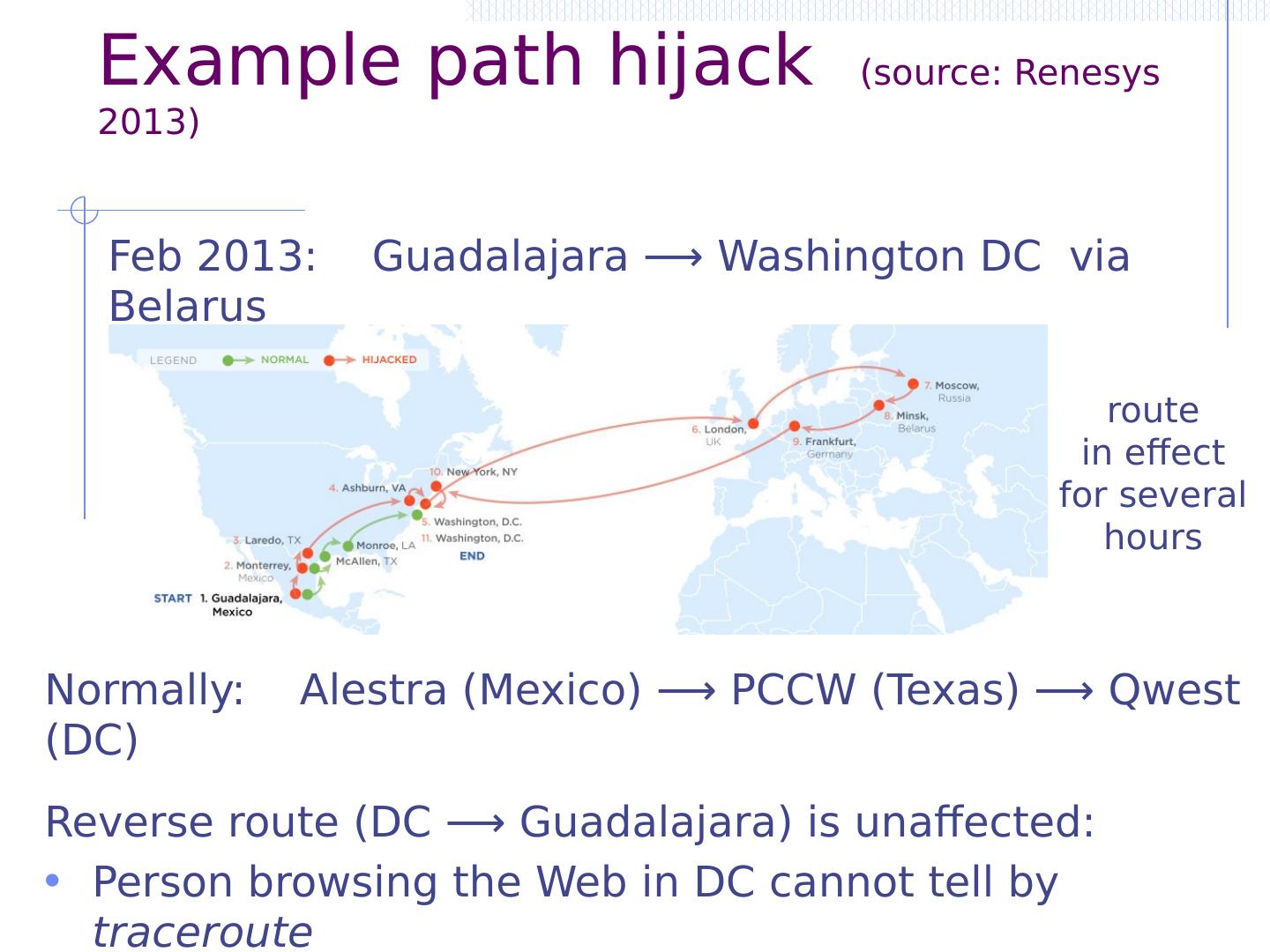 20 .Example path hijack (source: Renesys 2013) Feb 2013: Guadalajara ⟶ Washington DC via Belarus Normally: Alestra (Mexico) ⟶ PCCW (Texas) ⟶ Qwest (DC) Reverse route (DC ⟶ Guadalajara) is unaffected: Person browsing the Web in DC cannot tell by traceroute that HTTP responses are routed through Moscow r oute in effect f or several hours