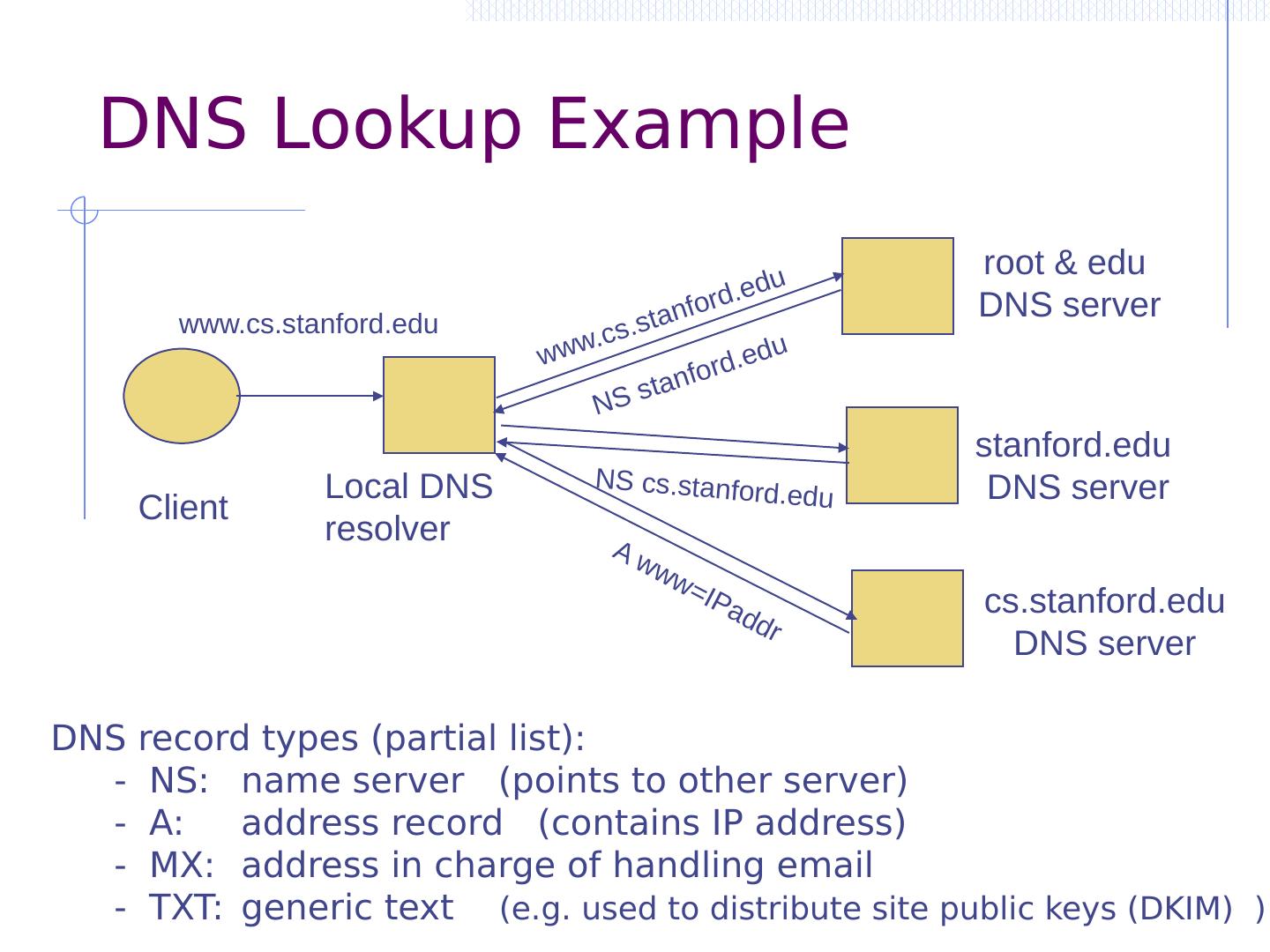 28 .DNS Lookup Example Client Local DNS resolver root & edu DNS server stanford.edu DNS server www.cs.stanford.edu NS stanford.edu www.cs.stanford.edu NS cs.stanford.edu A www=IPaddr cs.stanford.edu DNS server DNS record types (partial list): - NS: name server (points to other server) - A: address record (contains IP address) - MX: address in charge of handling email - TXT: generic text (e.g. used to distribute site public keys (DKIM) )