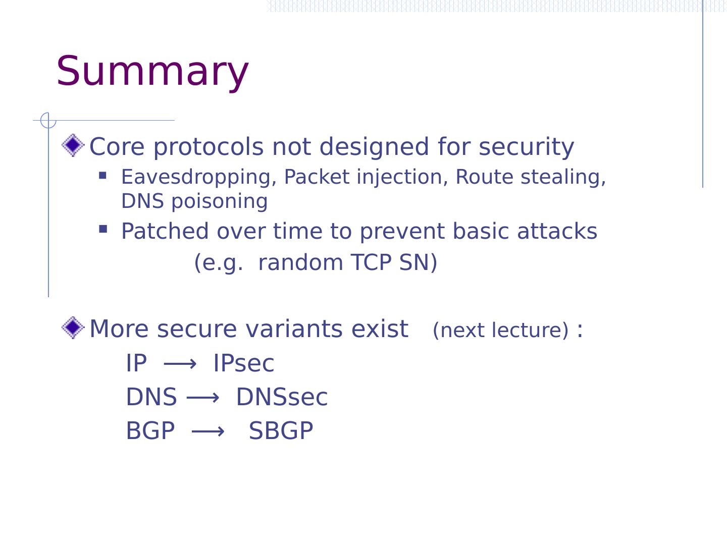 17 .Routing Protocols ARP ( addr resolution protocol): IP addr ⟶ eth addr Security issues: (local network attacks) Node A can confuse gateway into sending it traffic for Node B By proxying traffic, node A can read/inject packets into B ’ s session (e.g. WiFi networks) OSPF: used for routing within an AS BGP: routing between Autonomous Systems Security issues: unauthenticated route updates Anyone can cause entire Internet to send traffic for a victim IP to attacker’s address Example: Youtube -Pakistan mishap (see DDoS lecture ) Anyone can hijack route to victim (next slides)