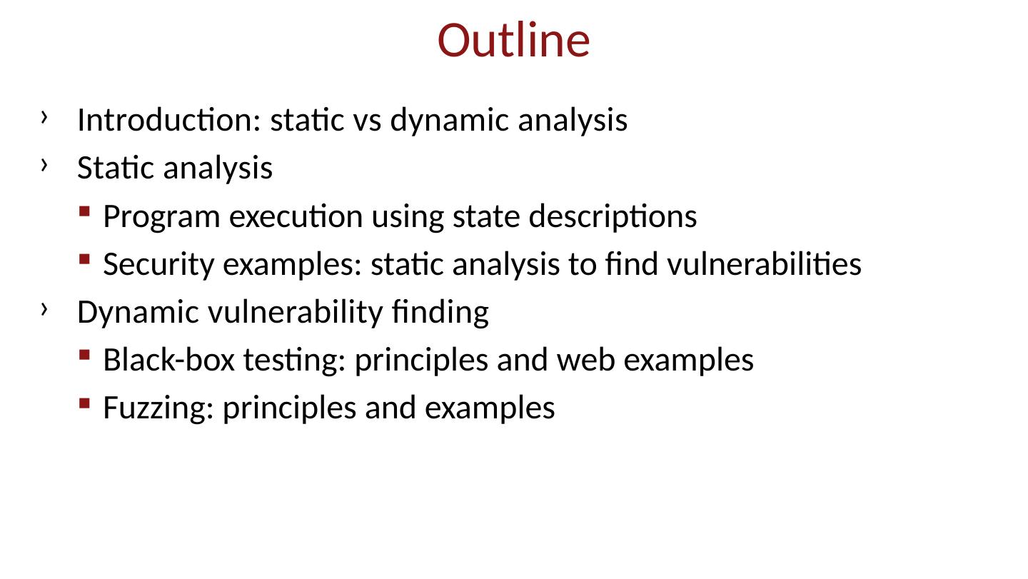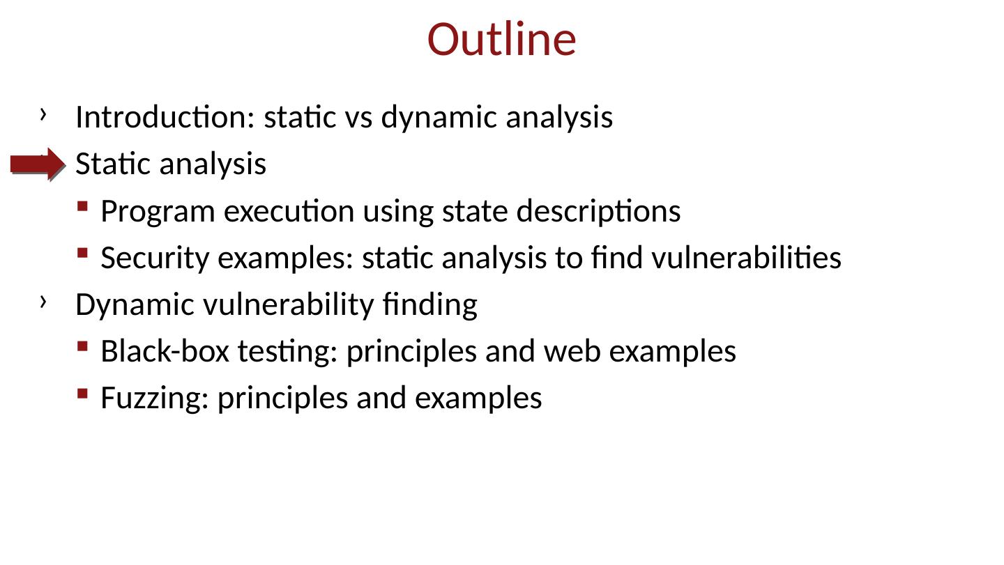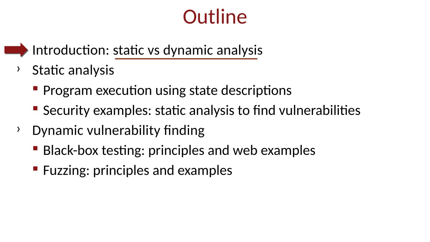 2 .Outline Introduction: static vs dynamic analysis Static analysis Program execution using state descriptions Security examples: static analysis to find vulnerabilities Dynamic vulnerability finding Black-box testing: principles and web examples Fuzzing: principles and examples