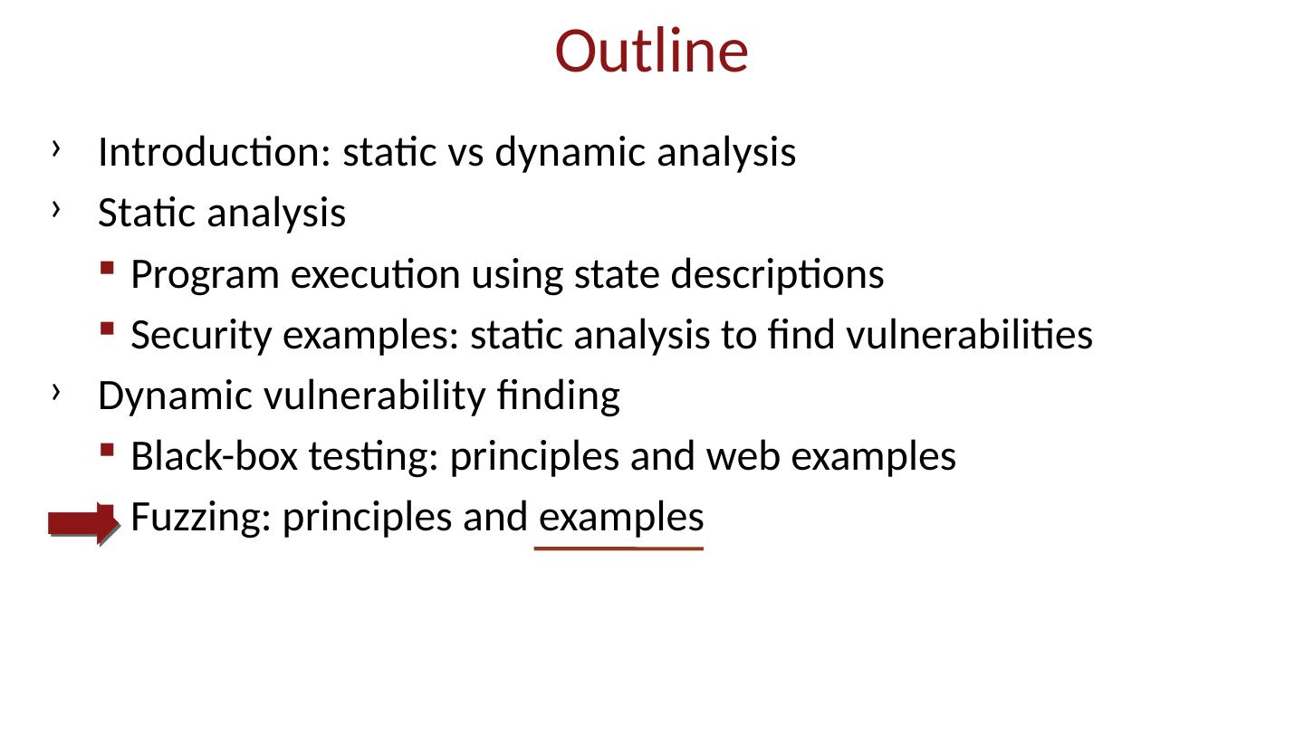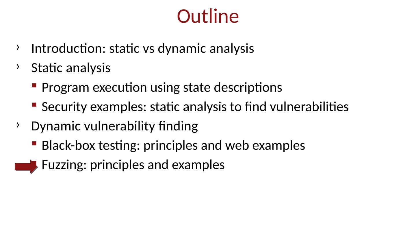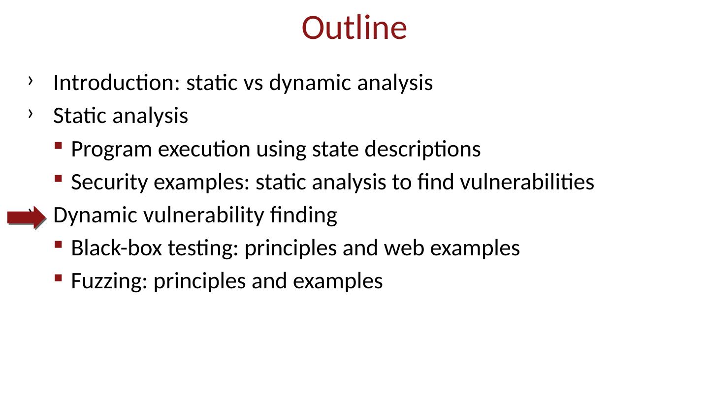2 .Outline Introduction: static vs dynamic analysis Static analysis Program execution using state descriptions Security examples: static analysis to find vulnerabilities Dynamic vulnerability finding Black-box testing: principles and web examples Fuzzing: principles and examples