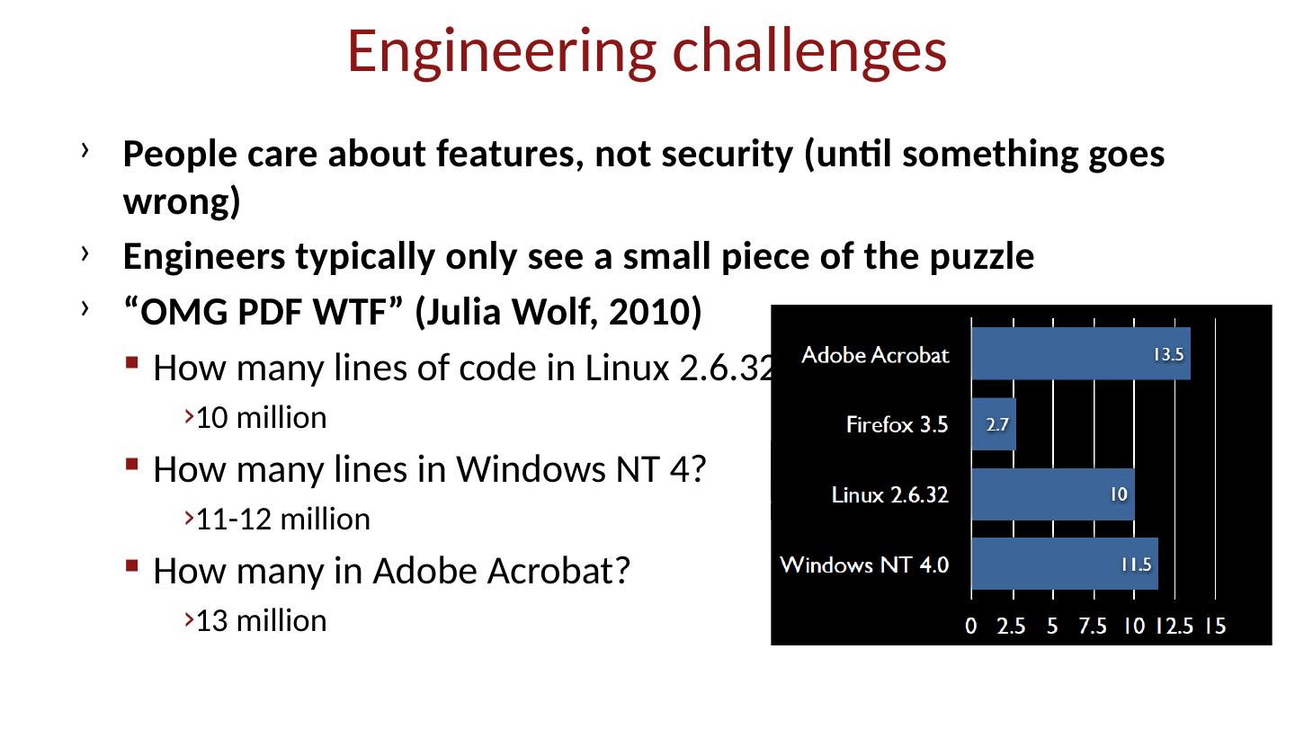 7 .Engineering challenges People care about features, not security (until something goes wrong) Engineers typically only see a small piece of the puzzle “OMG PDF WTF” (Julia Wolf, 2010) How many lines of code in Linux 2.6.32? 10 million How many lines in Windows NT 4? 11-12 million How many in Adobe Acrobat? 13 million